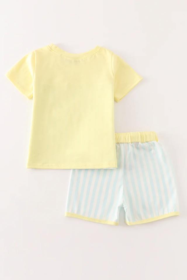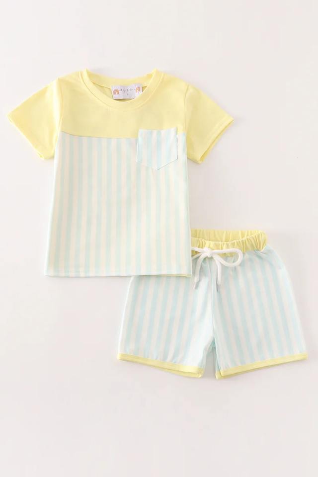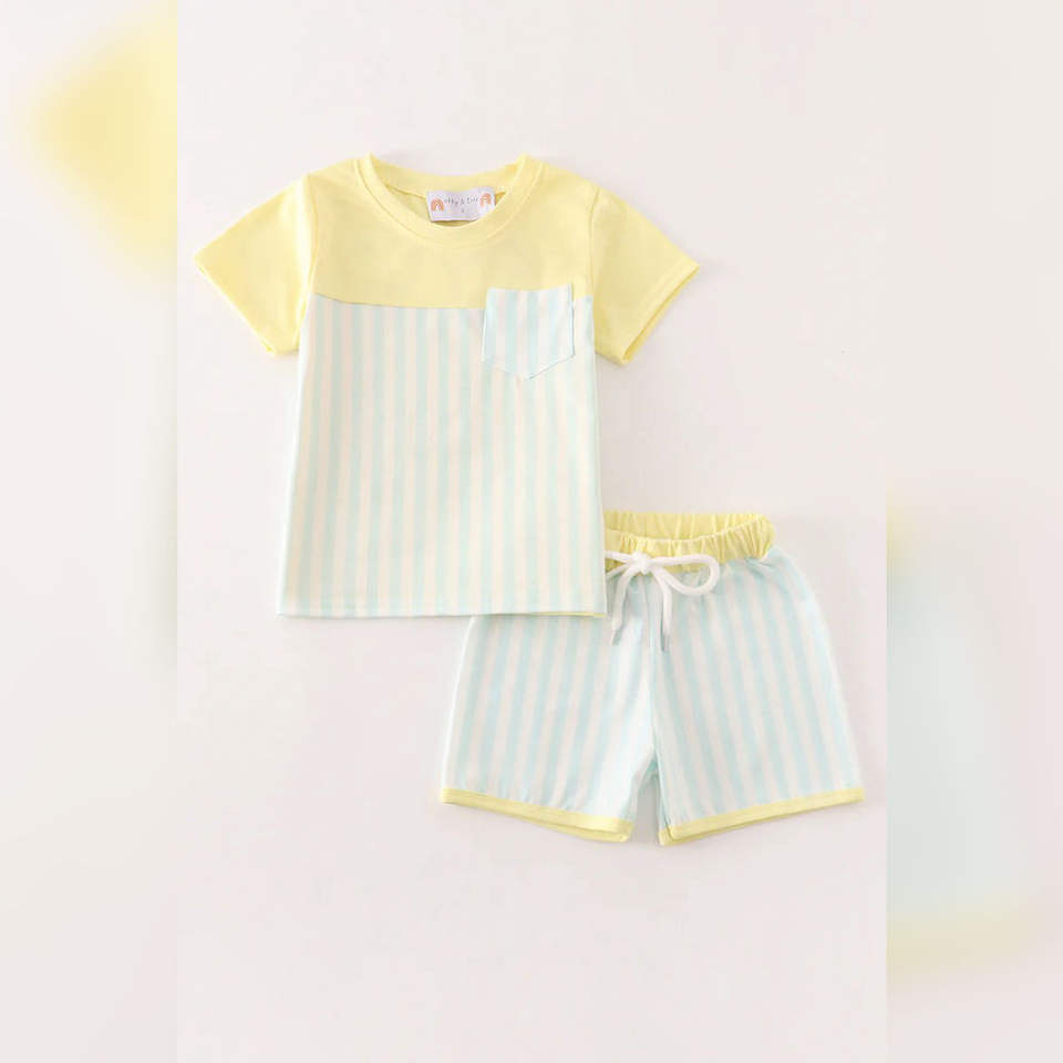 ชุดเสื้อผ้าเด็กฮันนี่ดิว คุณภาพสูง ผ้ายืด/ผ้าฝ้าย ลายทางสีน้ำเงิน ชุดลำลองสำหรับเด็กผู้ชาย เสื้อแขนสั้น ชุดสองชิ้นสำหรับฤดูร้อน