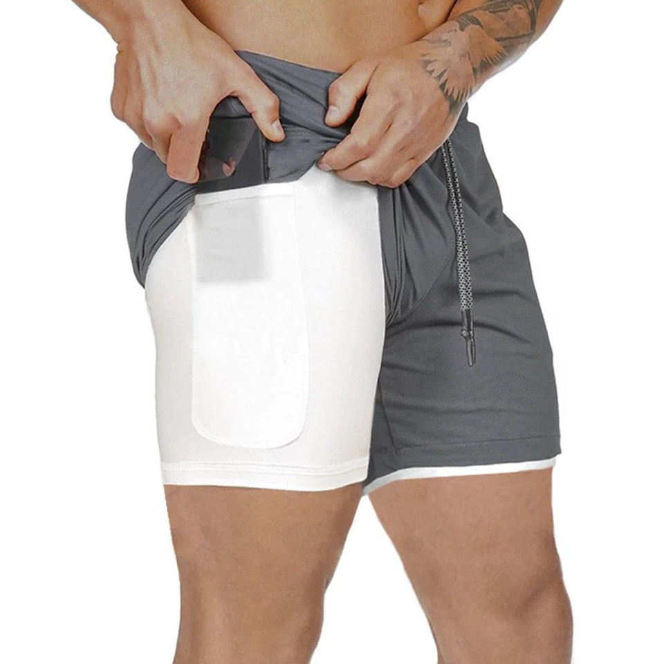 กางเกงขาสั้นวิ่งออกกำลังกายสำหรับผู้ชายแบบมีซิปสองชั้นแห้งเร็วสำหรับใส่ไปยิม