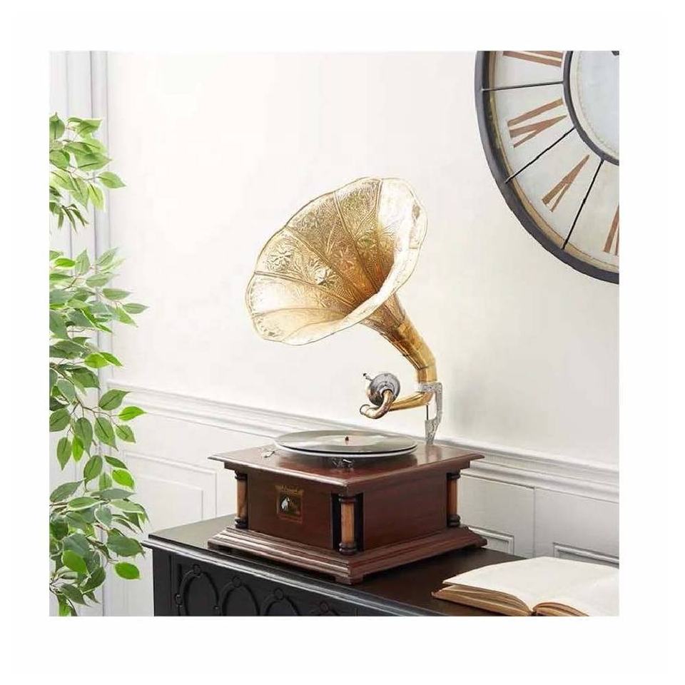 แผ่นเสียงฐานไม้สี่เหลี่ยมพร้อมแตรทองเหลืองทำด้วยมือสำหรับแผ่นเสียงโบราณ