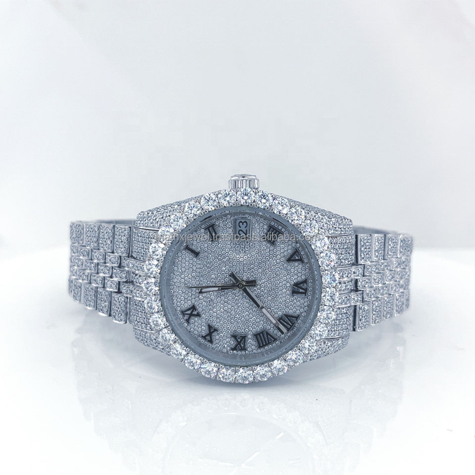 นาฬิกาโครโนกราฟสแตนเลสคุณภาพสูงผ่านการทดสอบเพชร VVS เพชรน้ำแข็งสีเงินนาฬิกากลไก