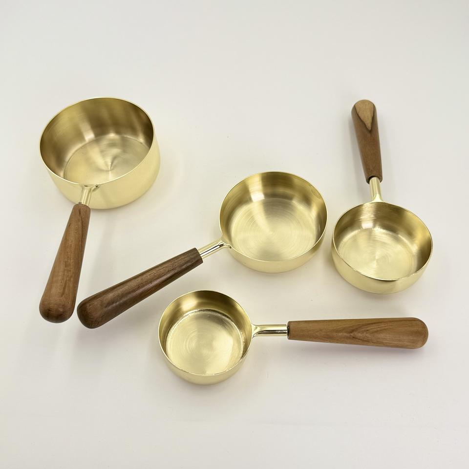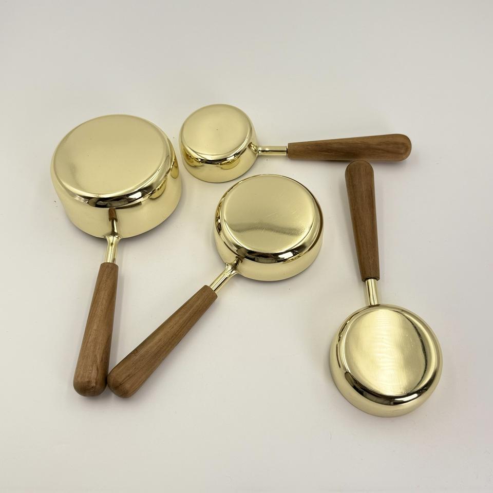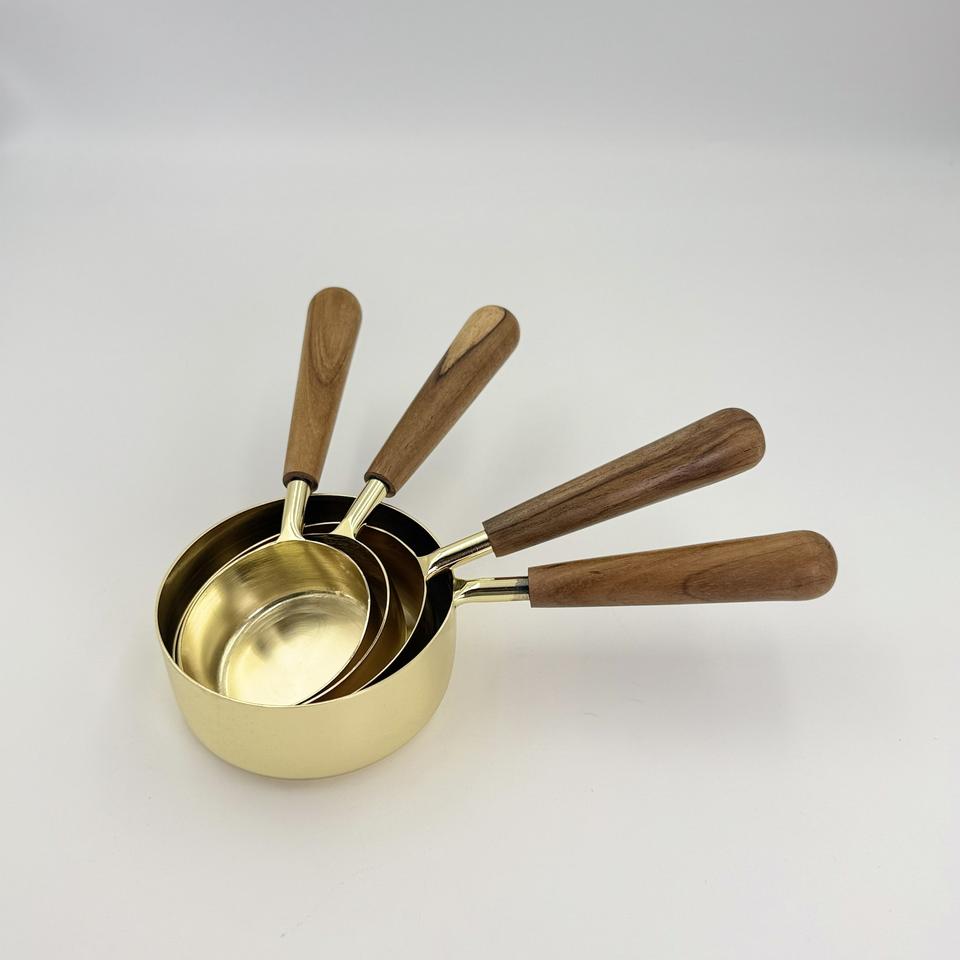 ถ้วยตวงและที่ตักสแตนเลสคุณภาพสูง เคลือบทอง พร้อมด้ามจับไม้กระถินเทศ คุณภาพพรีเมียม ใช้กับเครื่องล้างจานได้
