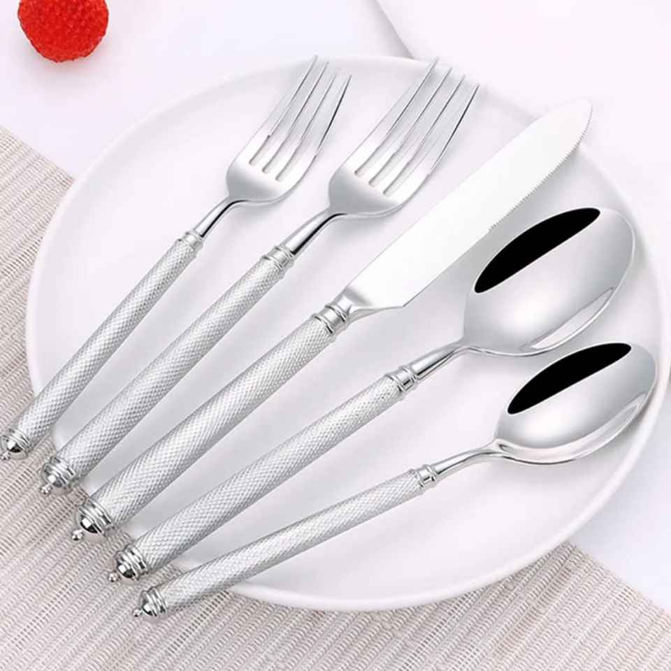ชุดช้อนส้อมสแตนเลสคุณภาพสูง ชุบเงิน หรูหรา เหมาะสำหรับโรงแรม งานแต่งงาน เป็นของชำร่วย เป็นมิตรกับสิ่งแวดล้อม ดีไซน์เรียบง่าย พร้อมโลโก้สั่งทำ