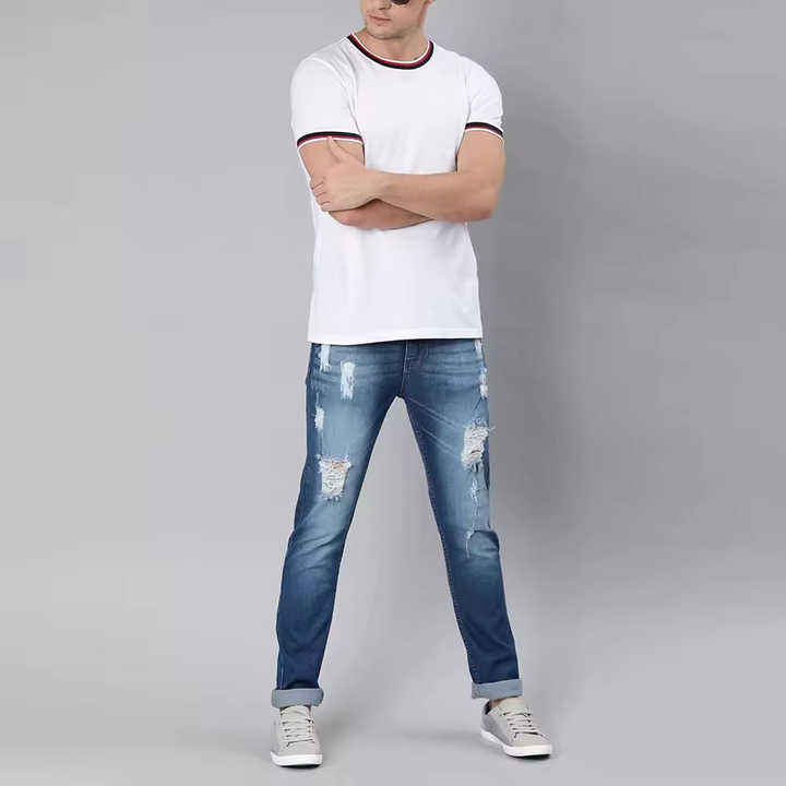 กางเกงยีนส์ขาตรงสำหรับผู้ชายกางเกงยีนส์ผ้ายืดทรงสลิมฟิต