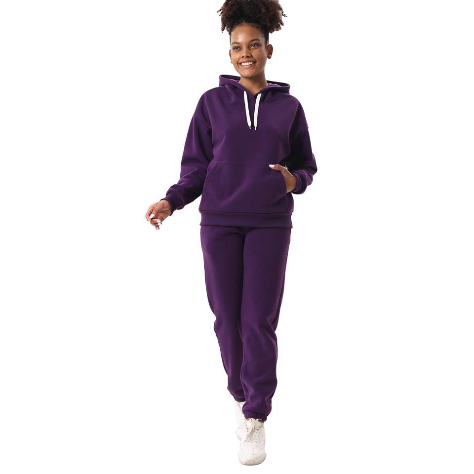 ชุดลำลองกีฬาผู้หญิงคุณภาพสูง ชุดวิ่งออกกำลังกายเอวสูงแบบสองชิ้น กางเกงขายาวและเสื้อฮู้ดดี้ ผ้าฝ้ายแท้ 100% สีพื้น