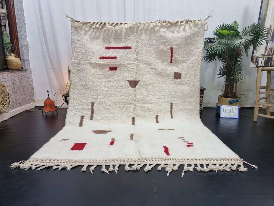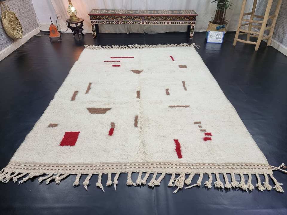 Beniourain พรมขนสัตว์สไตล์โมร็อคกันแบบแอบสแตรกสีขาวและแดงแฮนด์เมดพรมเรียบ