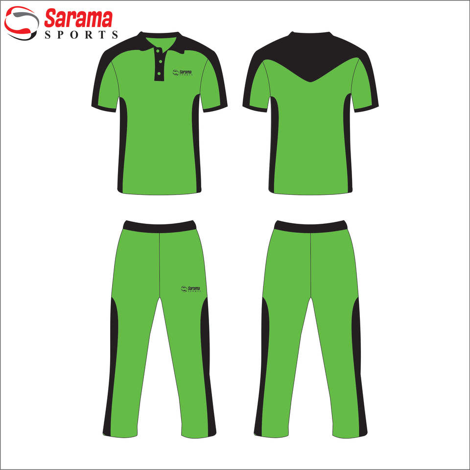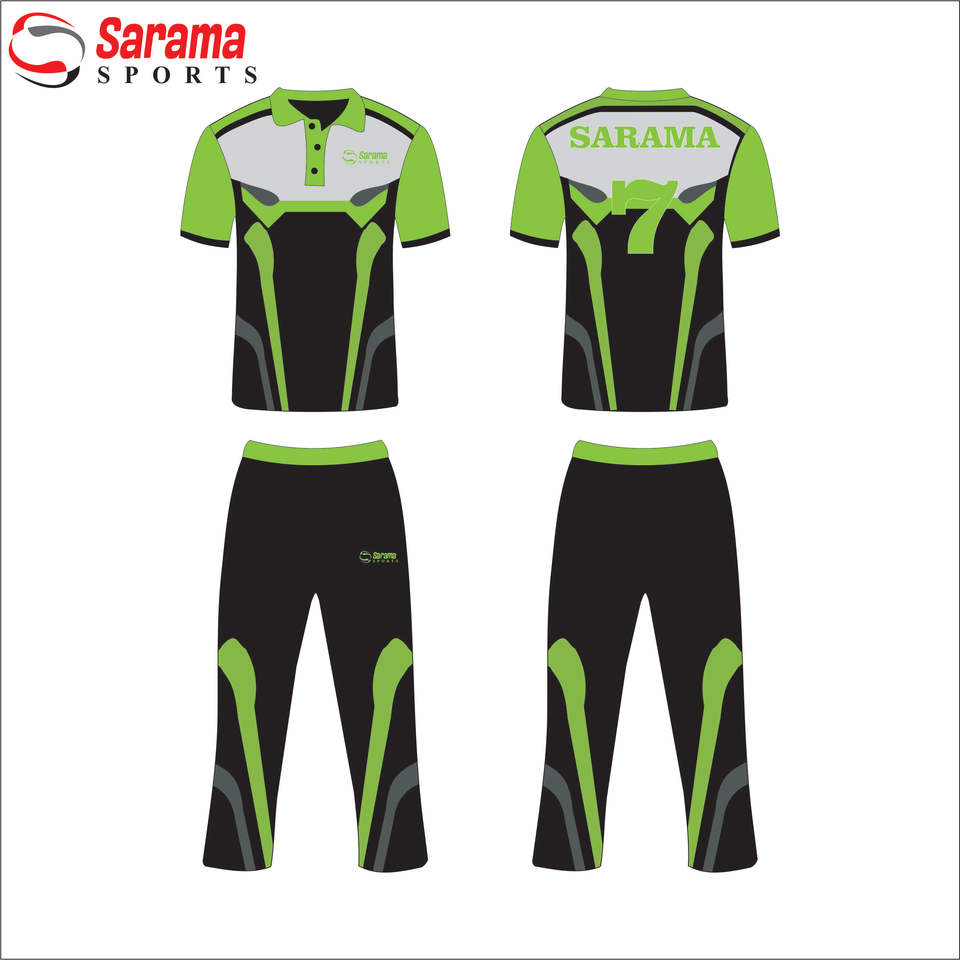 ชุดยูนิฟอร์มคริกเก็ตชายคุณภาพสูงแบบซับลิเมชั่น ยี่ห้อ Sarama Sports พร้อมโลโก้แบรนด์และชื่อทีมตามสั่ง เนื้อผ้าโพลีเอสเตอร์ ระบายอากาศได้ดี