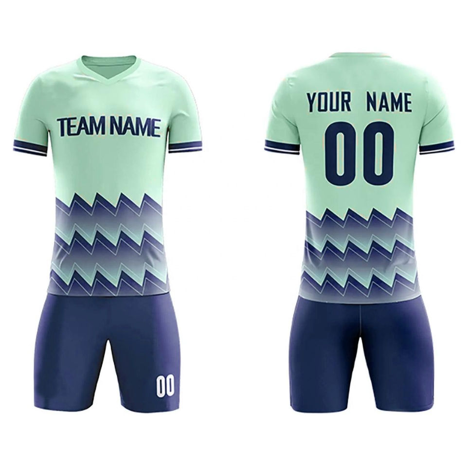 ชุดฟุตบอลพิมพ์ลายดิจิทัลคุณภาพสูง พิมพ์โลโก้ตามสั่ง ผ้าโพลีเอสเตอร์ 100% กันน้ำ แห้งเร็ว ระบายอากาศได้ดี น้ำหนักเบา