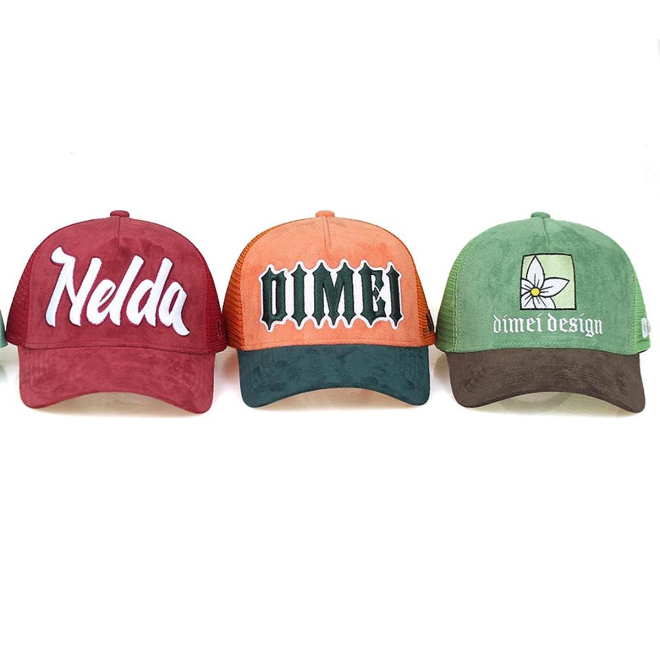 หมวกแก๊ปทรงทรัคเกอร์หนังกลับคุณภาพสูง หมวกตาข่าย ปักลาย 3 มิติ แบบกำหนดเอง 5 แผง ปีกโค้ง หมวกเบสบอล ขายส่ง