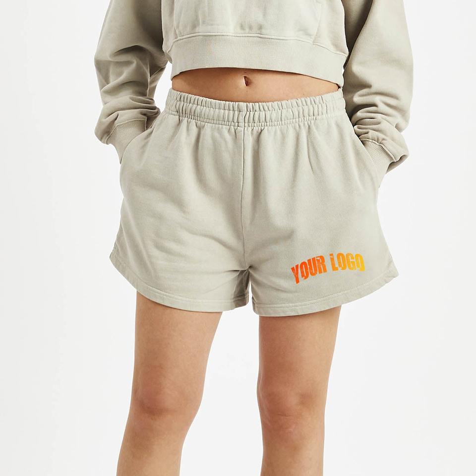 กางเกงขาสั้นผ้าฝ้าย100% เอวยางยืดมีกระเป๋าสำหรับผู้หญิงกางเกงขาสั้นผ้าคอตตอนพร้อมโลโก้ออกแบบได้ตามต้องการสำหรับฤดูร้อน
