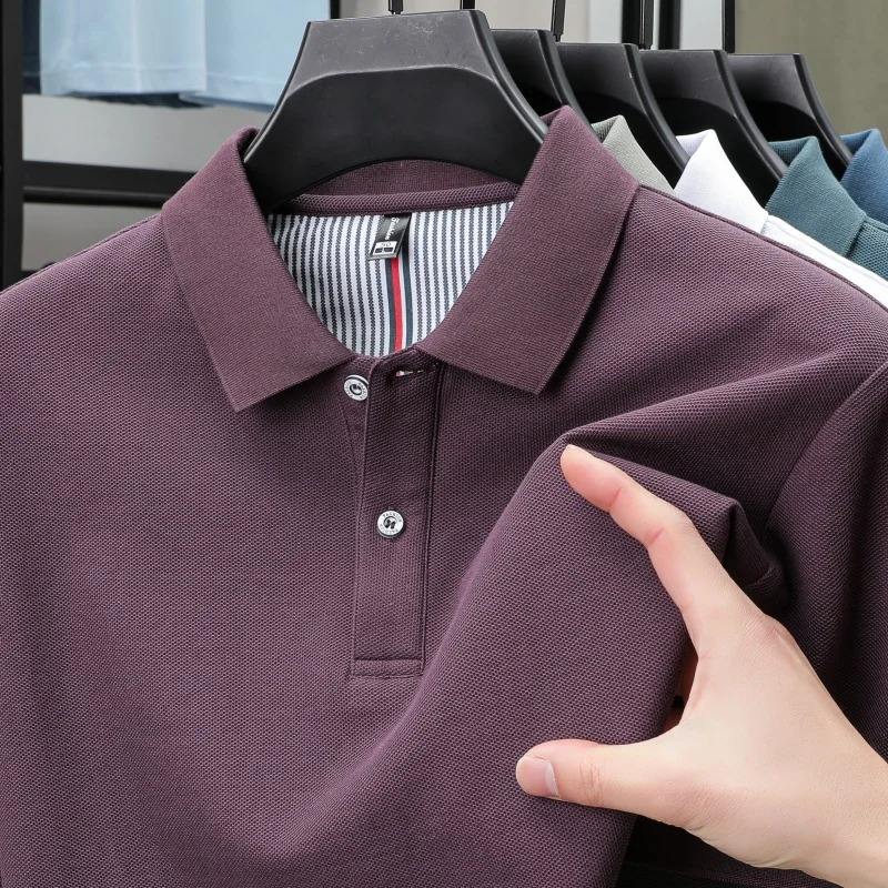 เสื้อโปโลผู้ชายแฟชั่นฤดูร้อนเสื้อบูติกสีพื้นมีคอลายทางด้านหลังขนาดพิเศษ