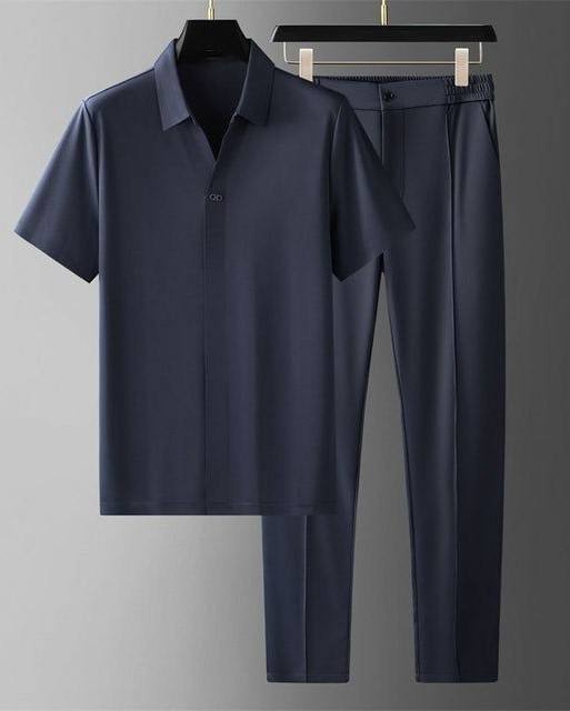 ชุดเสื้อเชิ้ตแขนสั้นลายทางสำหรับผู้ชายชุดสูทแบบติดกระดุมเสื้อและกางเกงขายาวสำหรับฤดูร้อน
