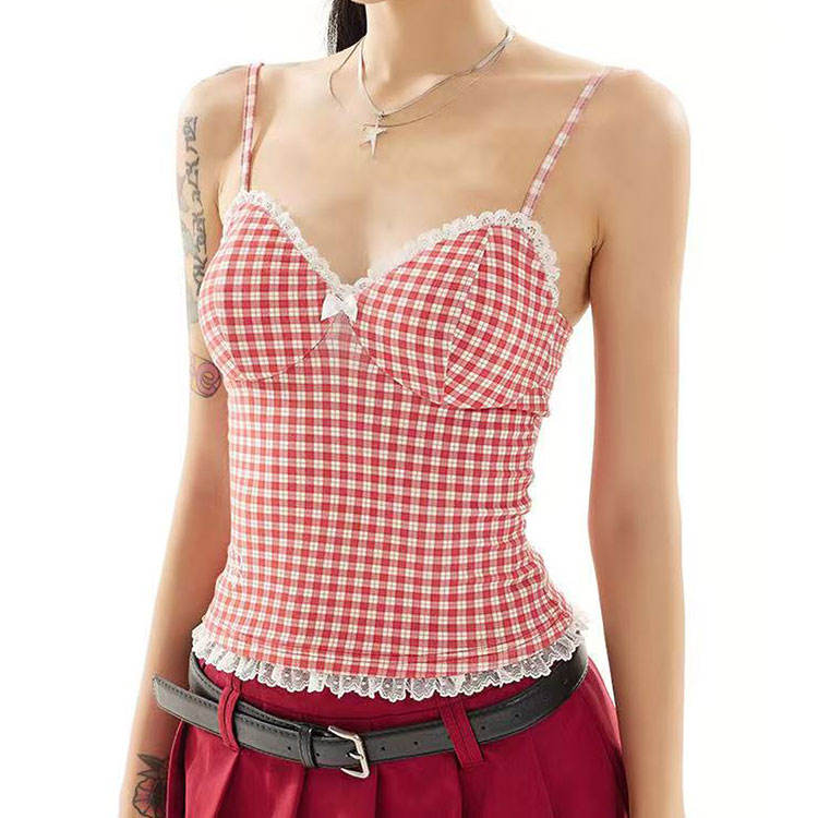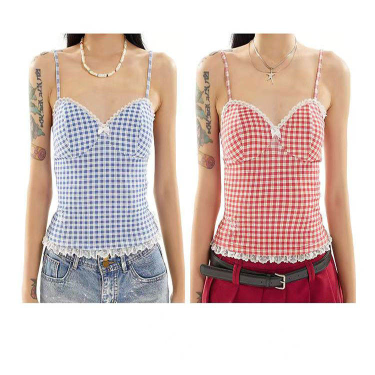 เสื้อกล้ามแบบประกบลายสก็อตขนาดเล็กเสื้อวินเทจเปิดหลังสายเดี่ยวผู้หญิงแฟชั่นใหม่ฤดูร้อน