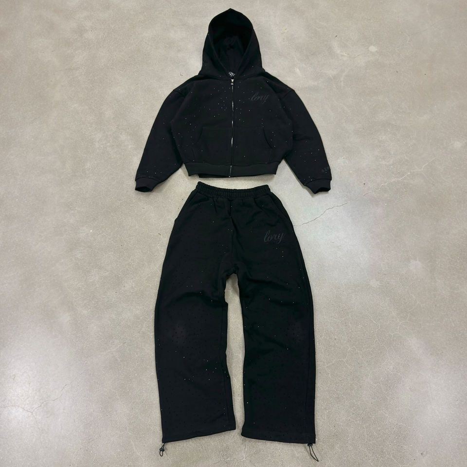 ชุดวอร์มสองชิ้นสำหรับผู้ชายชุดวอร์มปักลายสีดำโอเวอร์ไซส์