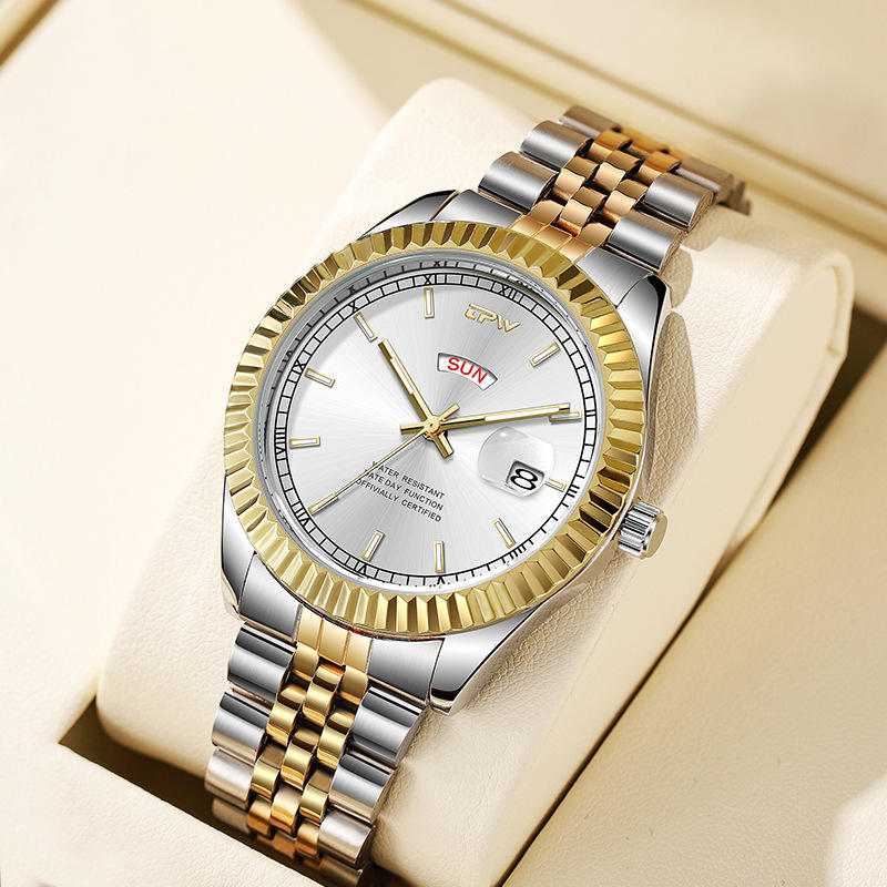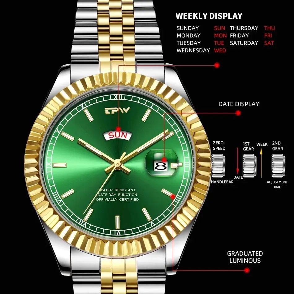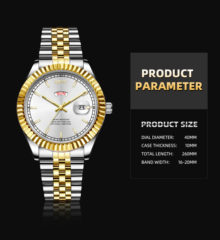 นาฬิกาข้อมือผู้ชายคุณภาพสูง TPW สีทองเงิน สแตนเลสสตีล หรูหรา พร้อมโลโก้ นาฬิกาควอตซ์ แสดงวันและวันที่