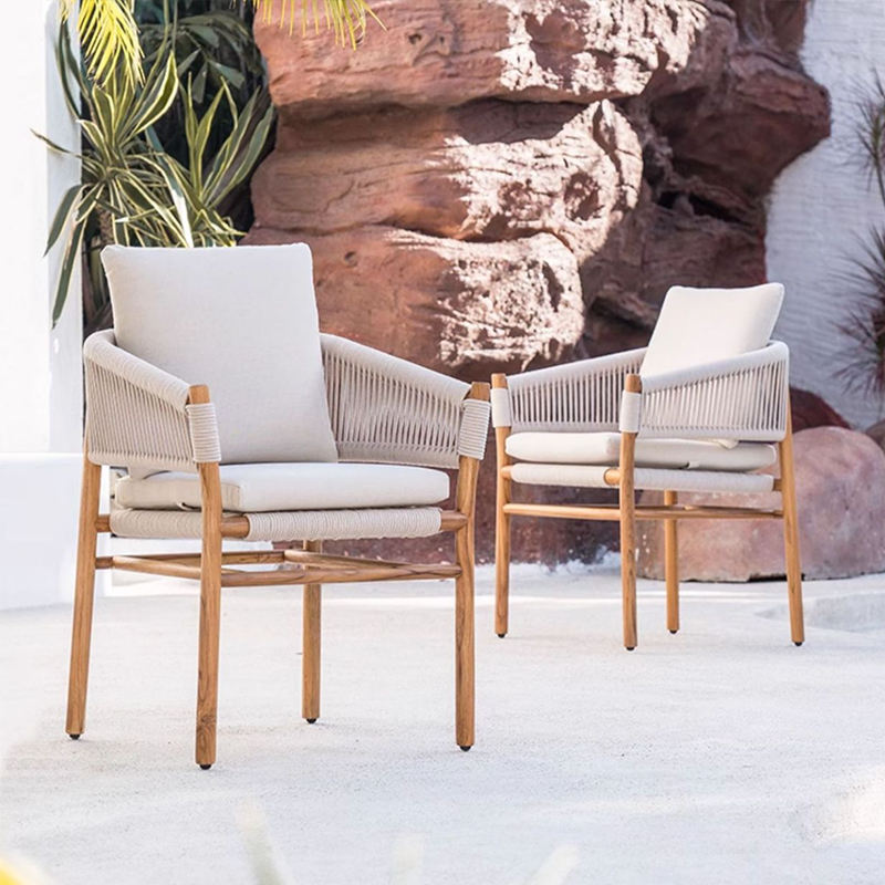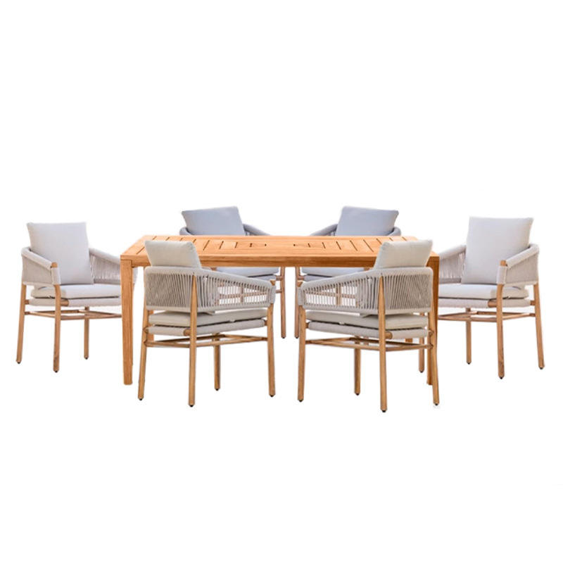 เฟอร์นิเจอร์ไม้สักคุณภาพสูงเบาะกันน้ำโต๊ะกระจกชุดรับประทานอาหารในสวนร้านอาหารกลางแจ้งทางเข้าโรงแรม