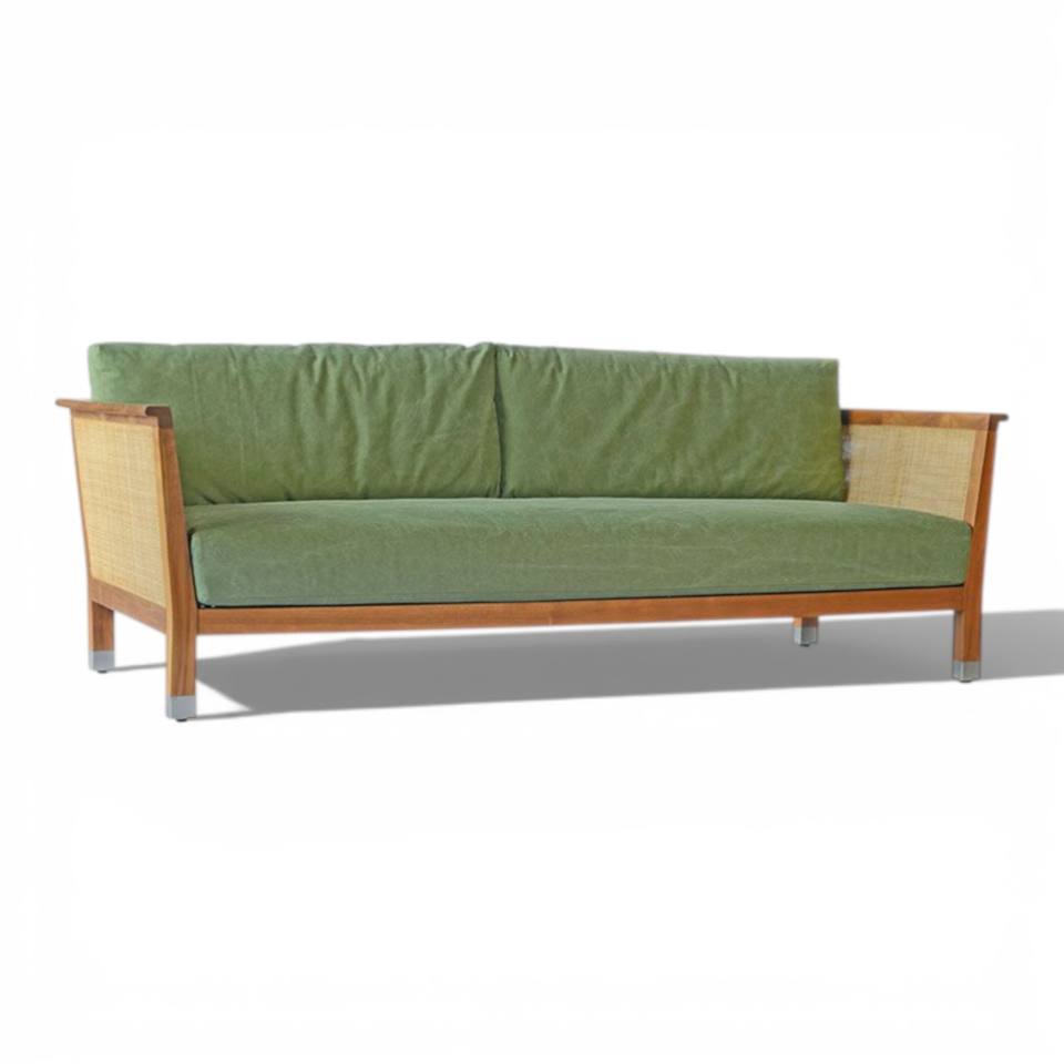 โซฟาไม้สักคุณภาพสูงสำหรับสวน พร้อมเบาะกันน้ำสำหรับกลางแจ้ง เฟอร์นิเจอร์หรูหรา โซฟาสำหรับระเบียง 2 ที่นั่ง พร้อมงานสานหวายธรรมชาติ