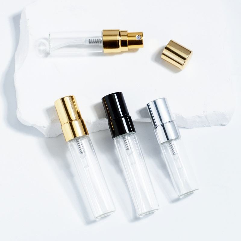 ขวดน้ำหอมแก้วหนาคุณภาพสูง ขนาด 2 มล. 3 มล. 5 มล. 10 มล. พร้อมหัวปั๊มสเปรย์ละอองละเอียด สำหรับครีมบำรุงผิว ฝาอลูมิเนียมสีเงิน