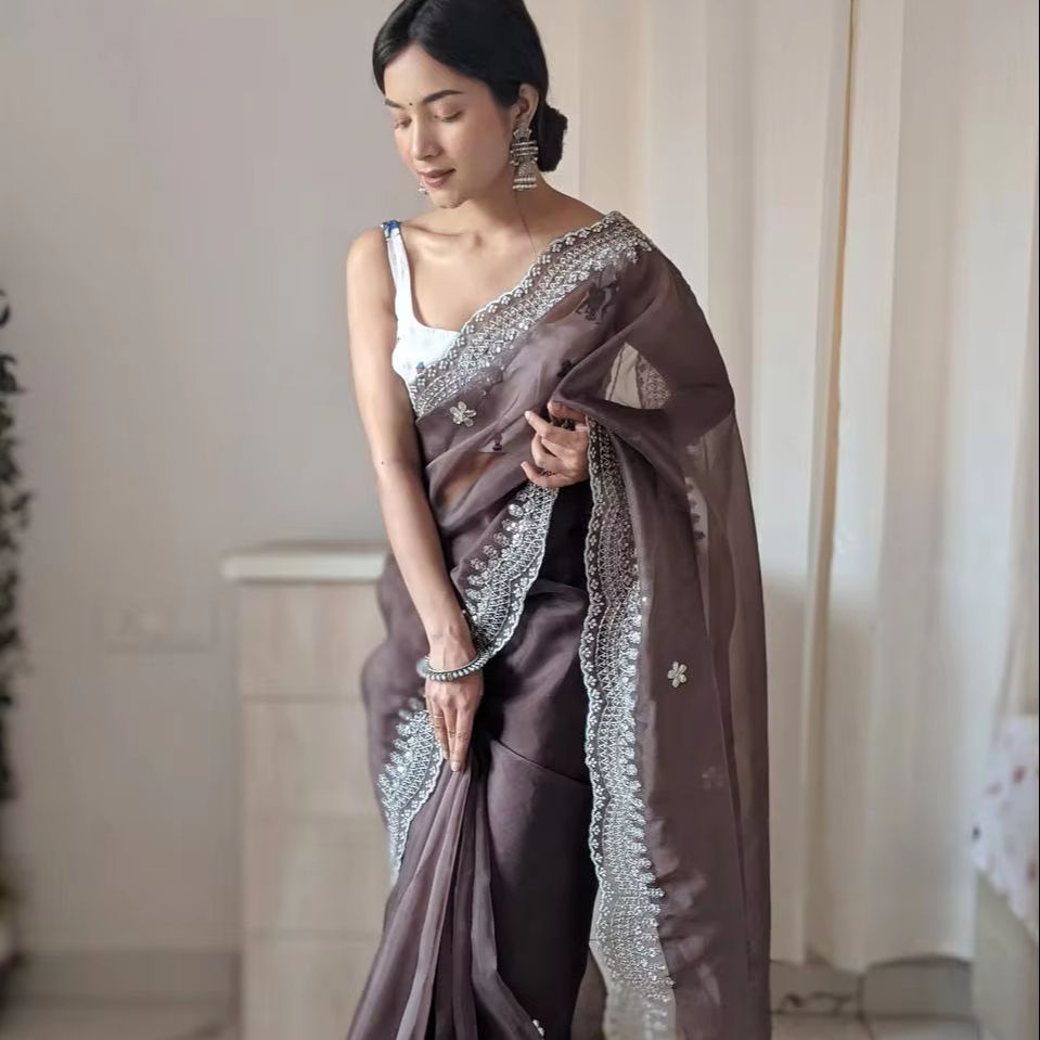 ส่าหรีปักแบบดั้งเดิมพร้อมงานทำมือปักเลื่อมขอบผ้าไหมออร์แกนซ่าที่สวยงามสำหรับงานแต่งงานและงานปาร์ตี้