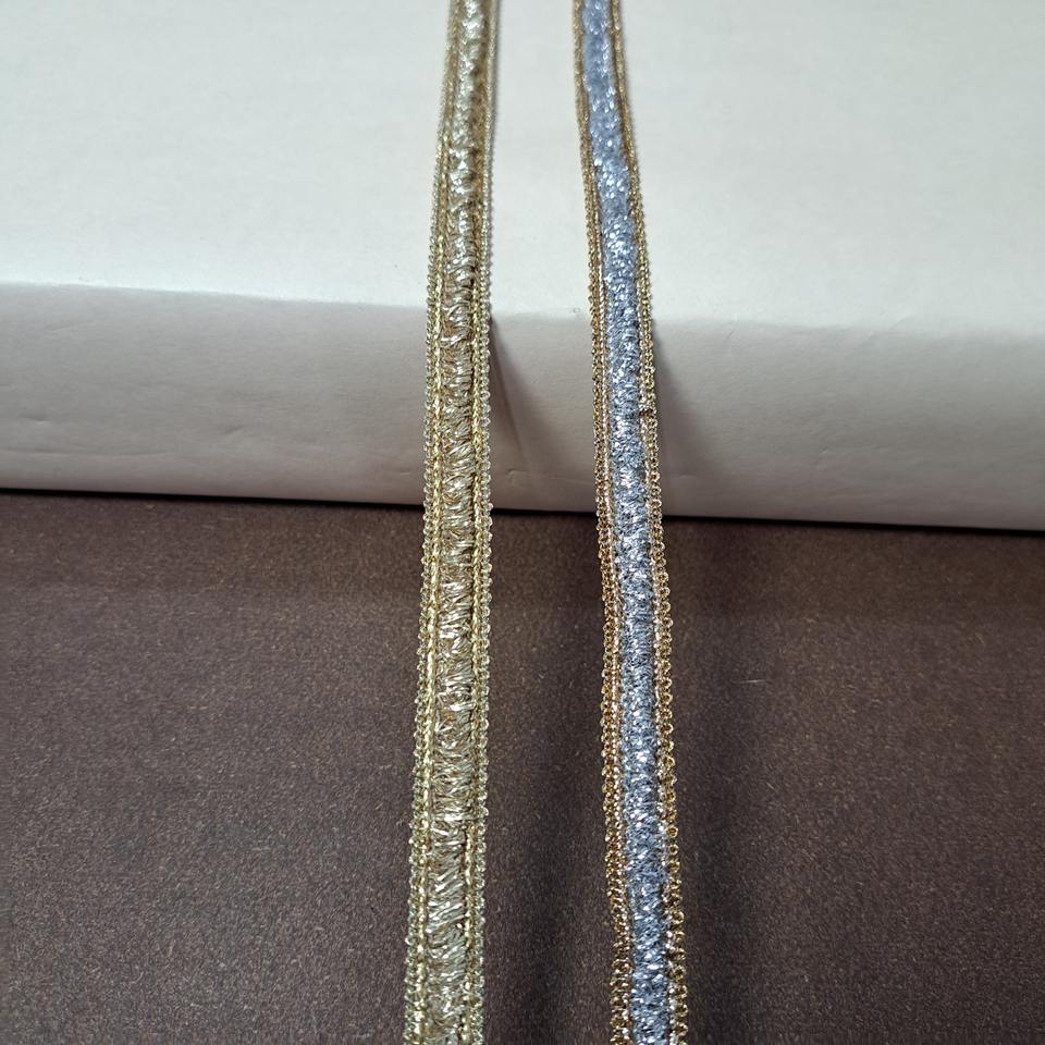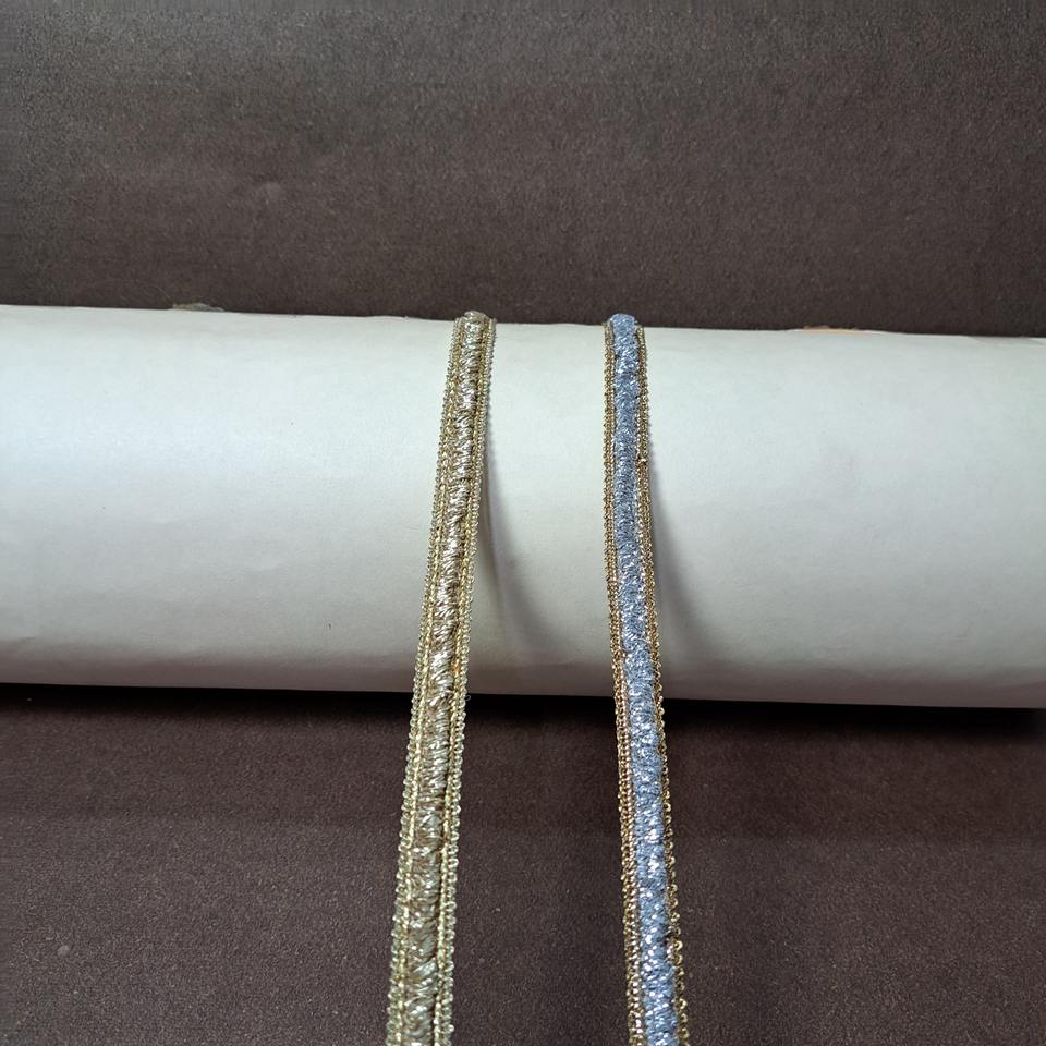ลูกไม้ตกแต่งสีทองเงินคุณภาพสูงแบบดั้งเดิม พร้อมด้วยด้ายโลหะ เป็นมิตรกับสิ่งแวดล้อม เหมาะสำหรับชุดแฟนซีสไตล์วินเทจและชุดชาติพันธุ์