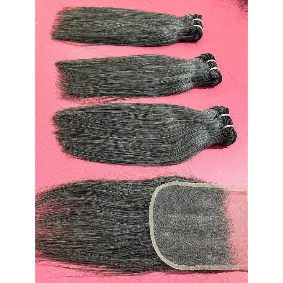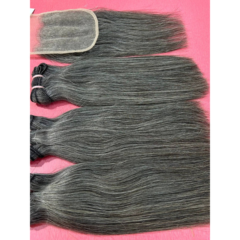 ผมต่อจากผมมนุษย์ดิบแบบไม่ผ่านกระบวนการผมชาวอินเดียแบบมีการปิดแบบ HD และมัดผมตรงสีเทาธรรมชาติ