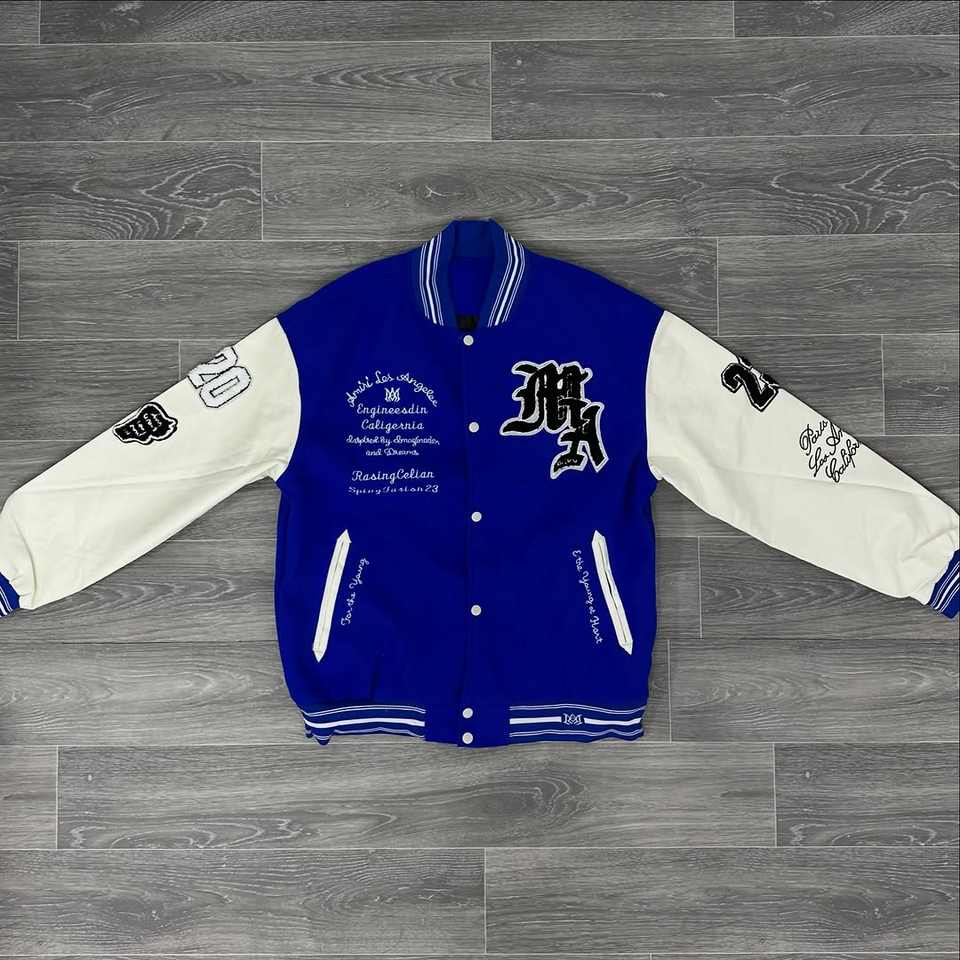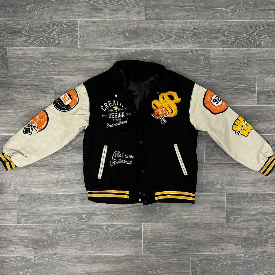 แจ็คเก็ตวาร์ซิตี้คุณภาพสูงสำหรับฤดูหนาว แบบยูนิเซ็กซ์ ทำจากขนสัตว์ 100% พร้อมงานปักไหมเชนิลล์ที่แขนเสื้อ โลโก้ด้านหน้า ขายส่งและรับสั่งทำ