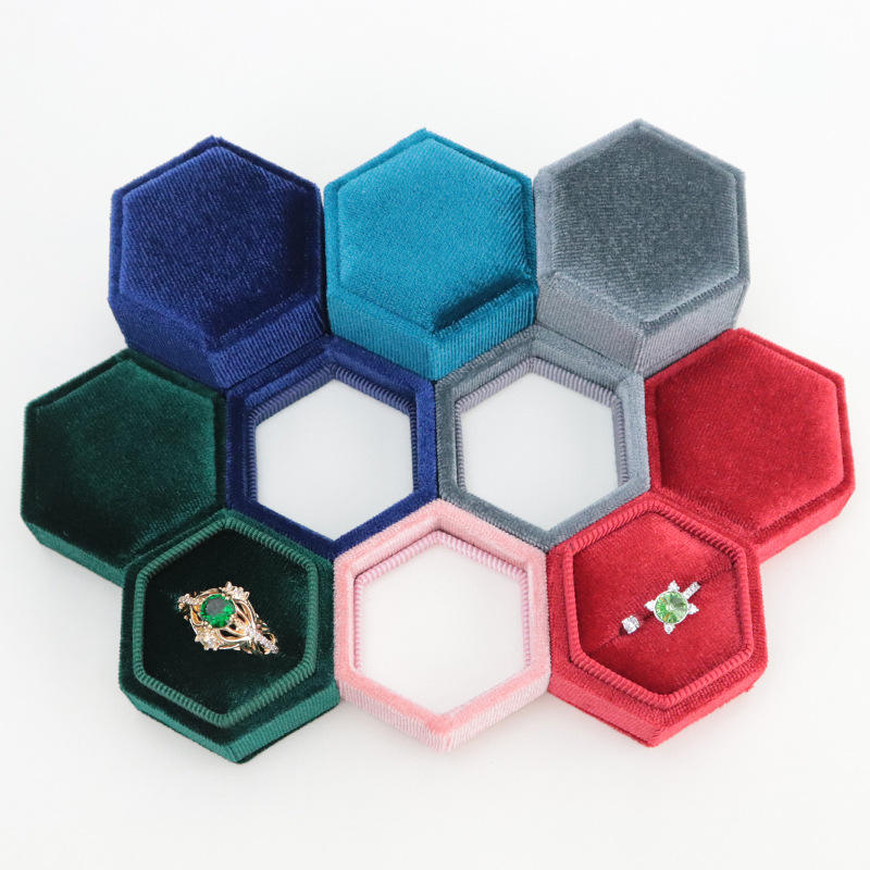 กล่องใส่แหวนกำมะหยี่คุณภาพสูง รูปทรงหกเหลี่ยม กล่องใส่แหวนกำมะหยี่แบบกำหนดโลโก้ได้ กล่องบรรจุภัณฑ์แหวนแต่งงาน