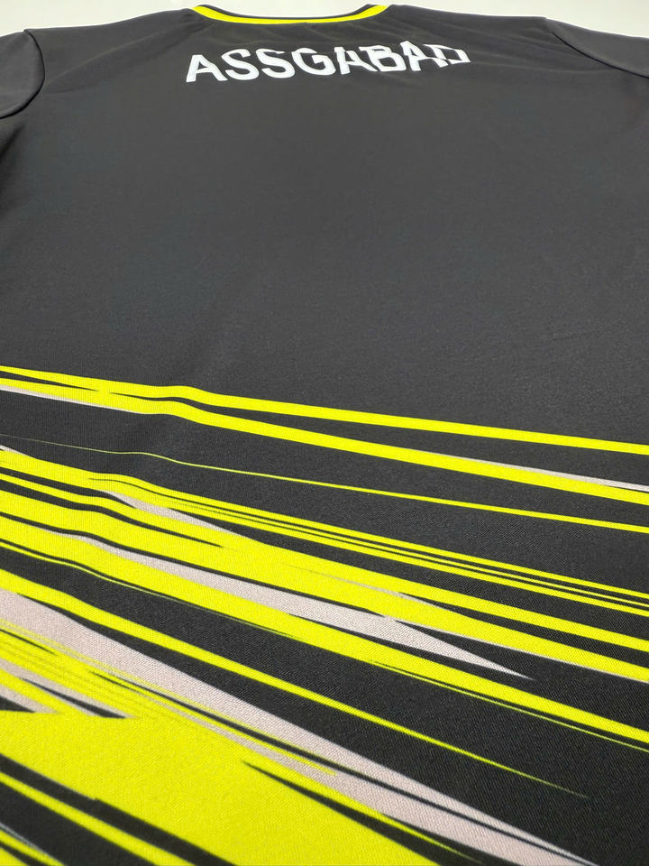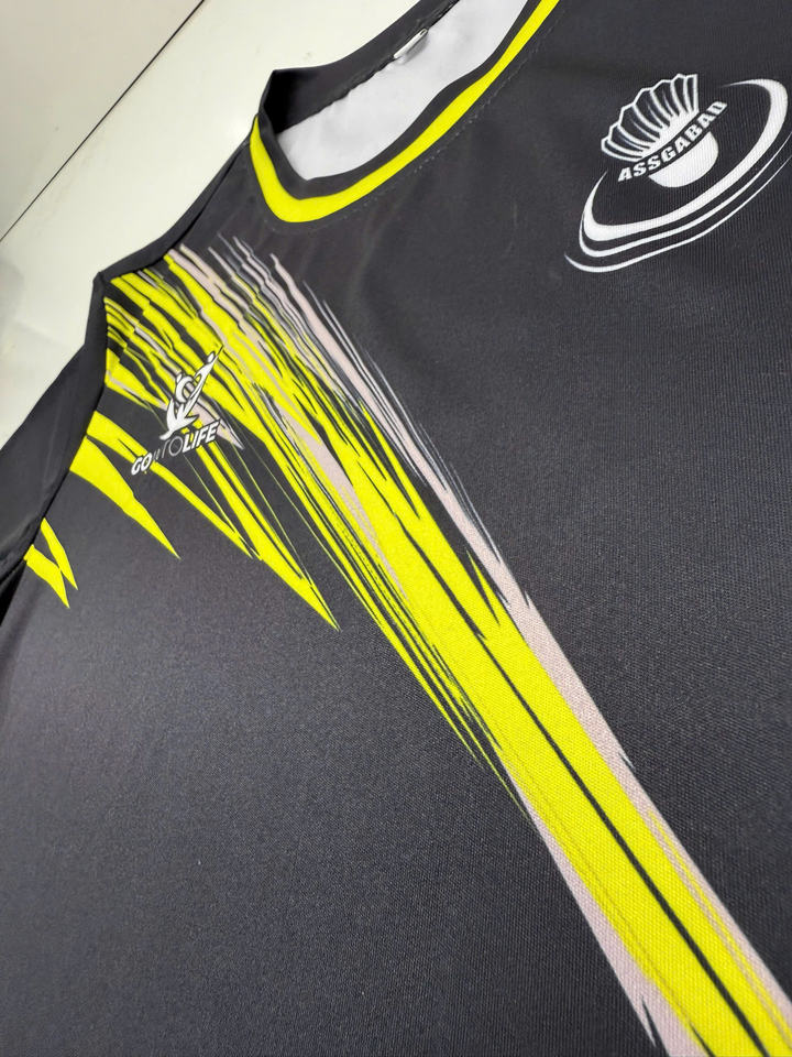 ออกแบบ:เสื้อคอกลมขอบเหลือง ฐานสีดำ ลายเส้นแนวทแยงนีออน