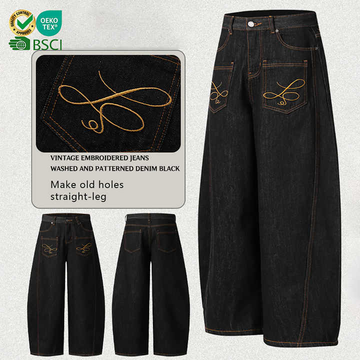กางเกงยีนส์ขากว้างสีดำวินเทจคุณภาพสูง ลวดลายนูน สไตล์สตรีทแวร์ ยูนิเซ็กส์ กันลม ระบายอากาศได้ดี เป็นมิตรกับสิ่งแวดล้อม