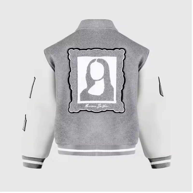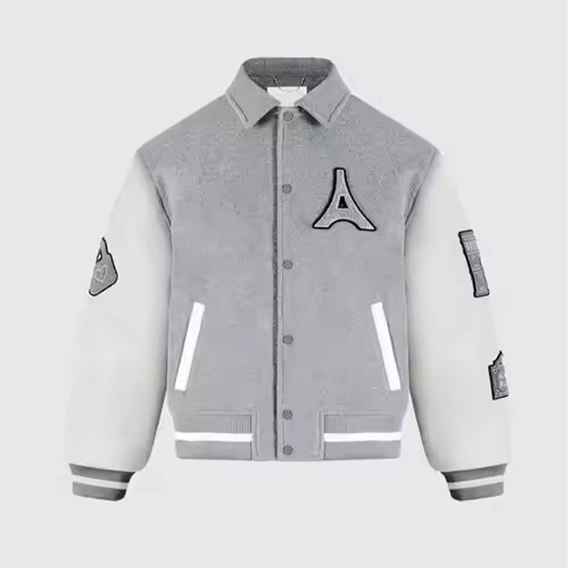 เสื้อแจ็คเก็ตวินเทจคุณภาพสูงสำหรับผู้ชาย ปักลายตามสั่ง ผ้าขนสัตว์สีเทาขาว ปักลายปารีส สไตล์วิทยาลัย สตรีทแวร์ ใหม่ สำหรับฤดูหนาว