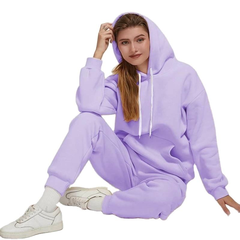 ชุดวอร์มสไตล์วินเทจคุณภาพสูงสำหรับผู้หญิง ฤดูหนาว ผลิตตามแบบ OEM ผ้าฝ้ายฟลีซ 100% เสื้อฮู้ดแบบสวมหัว กางเกงขายาว ชุดลำลอง ระบายอากาศได้ดี