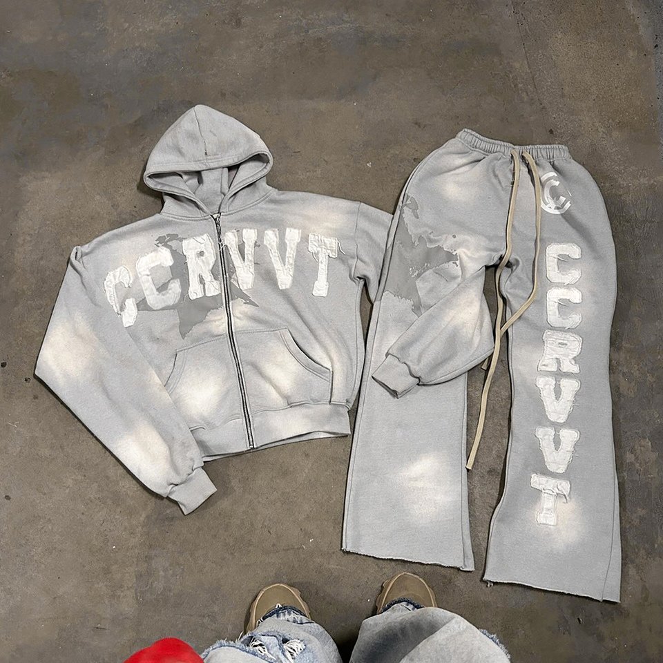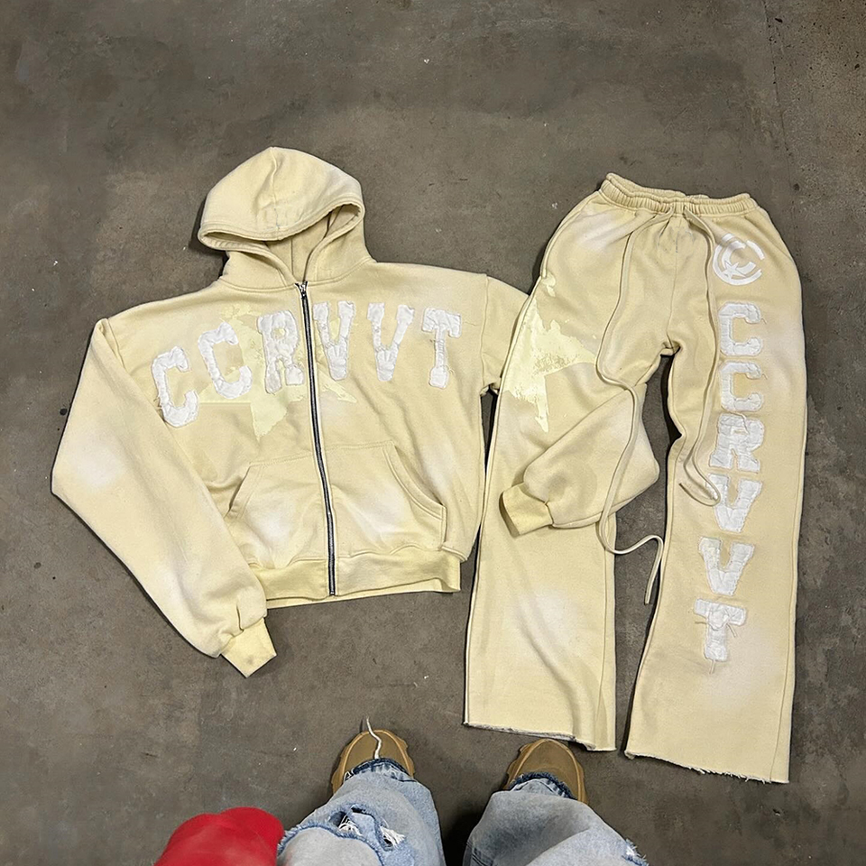 ชุดวอร์มฮู้ดสองชิ้นสไตล์วินเทจคุณภาพสูง ลวดลายปักแบบซันเฟด พร้อมปักโลโก้ตามสั่ง ผ้าหนาสำหรับฤดูหนาว
