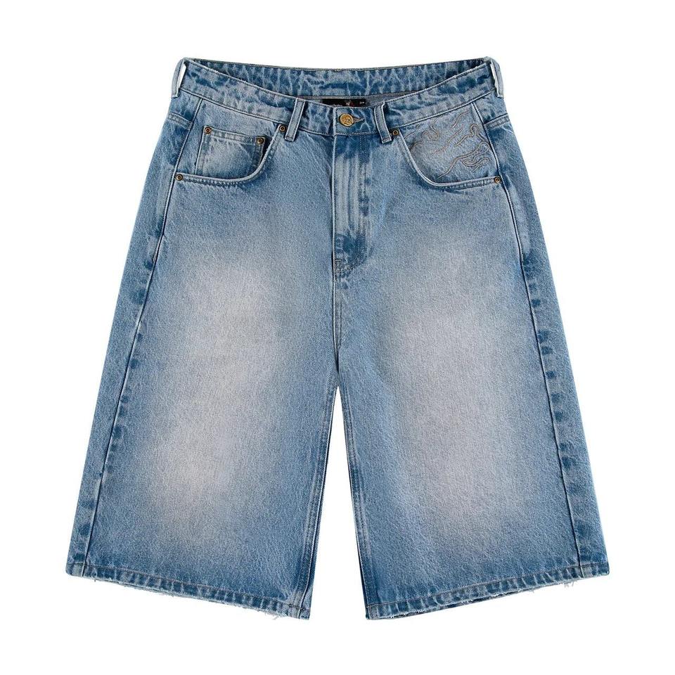 กางเกงยีนส์ขาสั้นวินเทจซักได้สำหรับผู้ชายกางเกงยีนส์ทรงหลวมแบบออกแบบได้ตามต้องการ