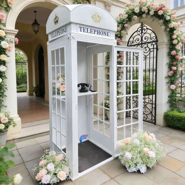 ตู้โทรศัพท์สีขาวสำหรับงานแต่งงานฉากหลังเสียงสมุดเยี่ยมตู้โทรศัพท์ลอนดอนสำหรับตกแต่งงานแต่งงาน