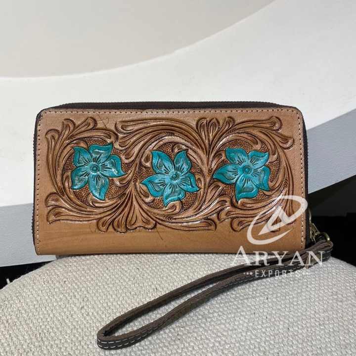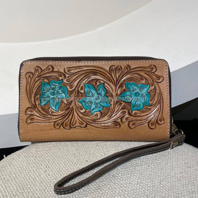 กระเป๋าสตางค์หนังแท้ลายเครื่องมือแบบตะวันตกคุณภาพสูงสำหรับผู้หญิงกระเป๋าใส่บัตรหรูหราทำด้วยมือสไตล์โบโฮ
