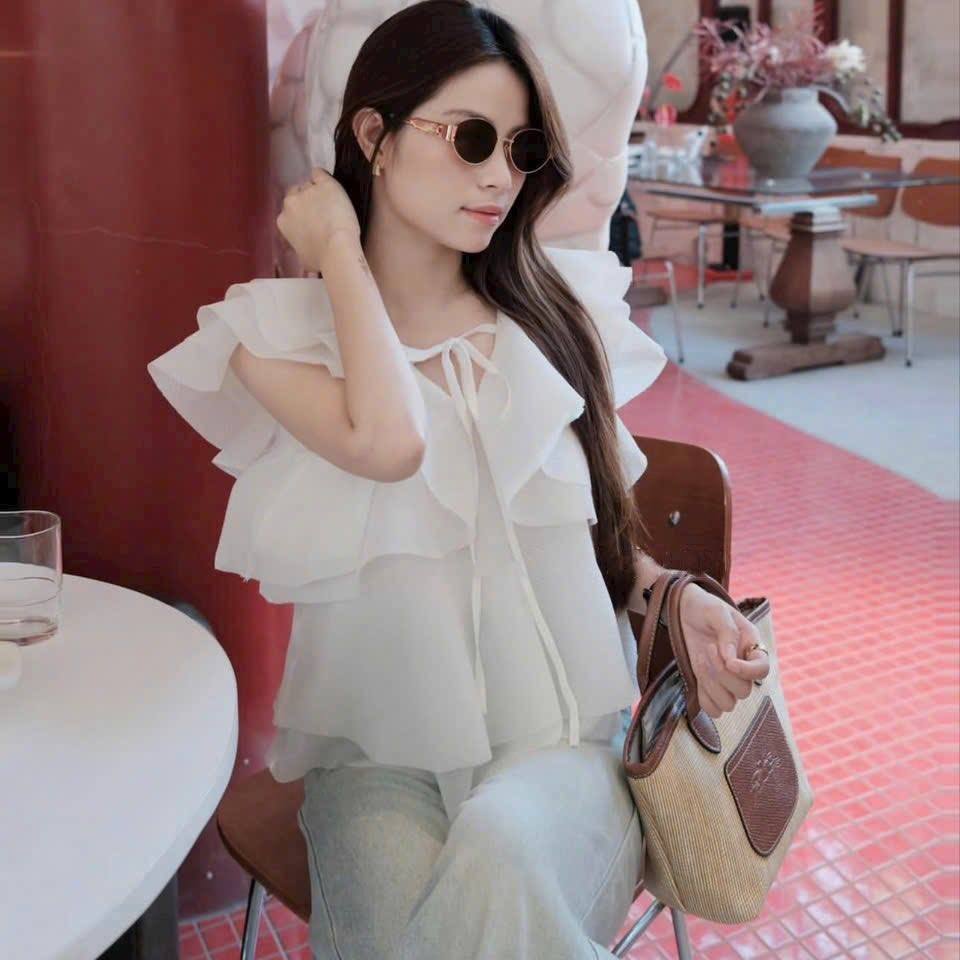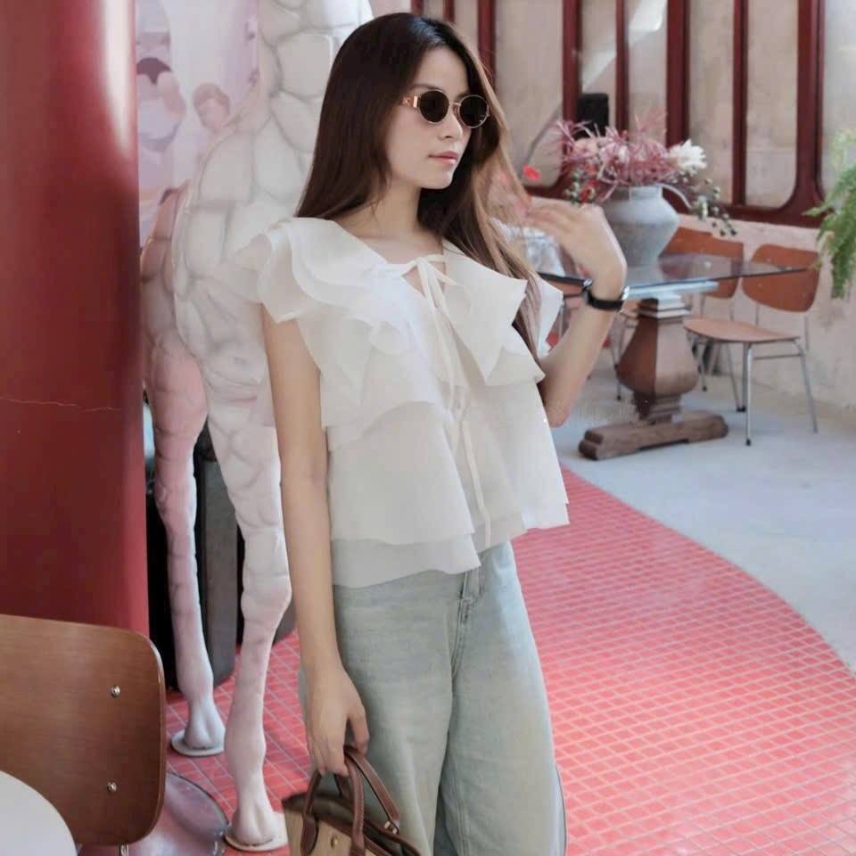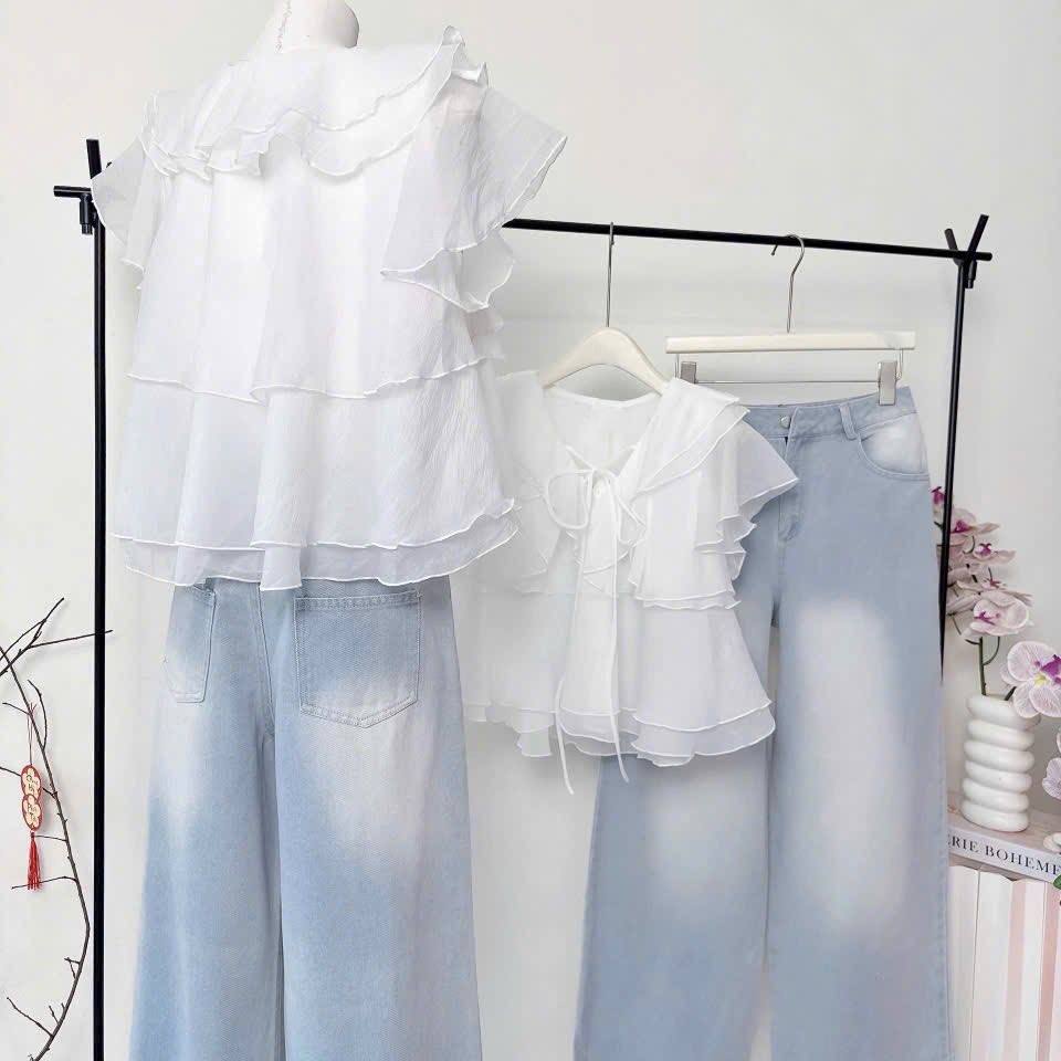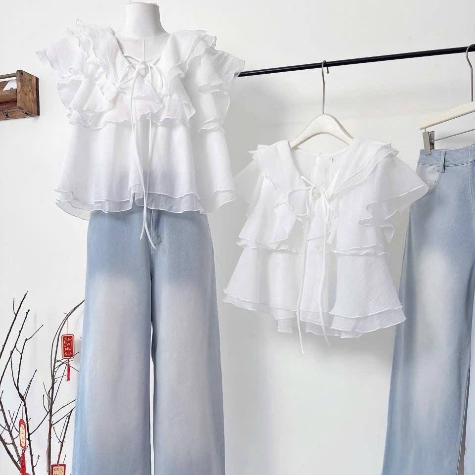 เสื้อชีฟองสีขาวคุณภาพสูงแบบหลายชั้นและกางเกงยีนส์สีฟ้าอ่อนชุดสองชิ้น