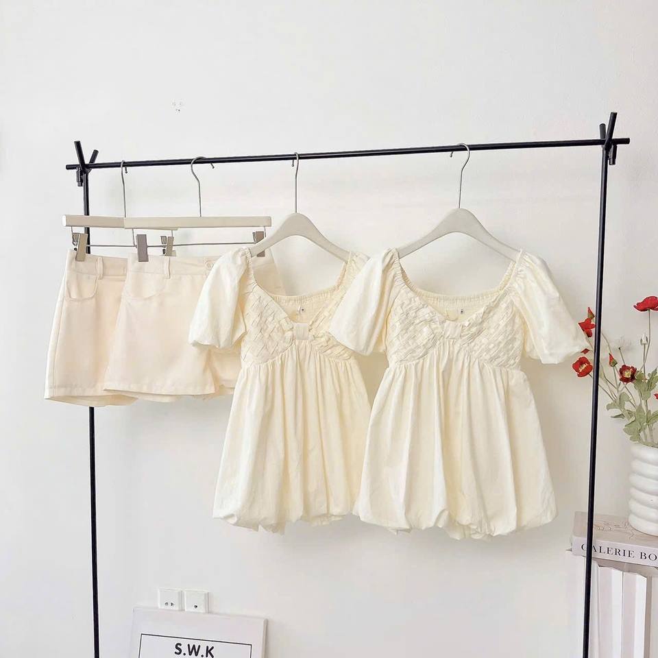 ชุดเดรสสั้นสีขาวคุณภาพสูง แขนพอง เอวสม็อค สำหรับผู้หญิง