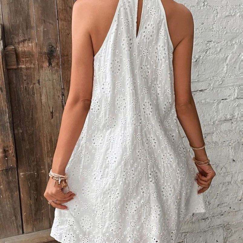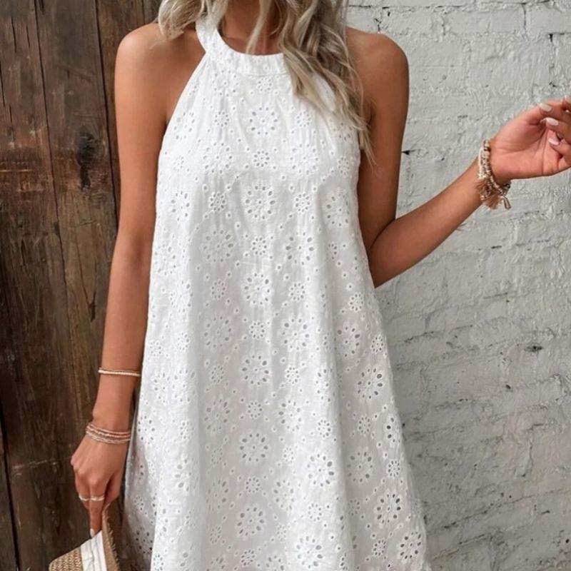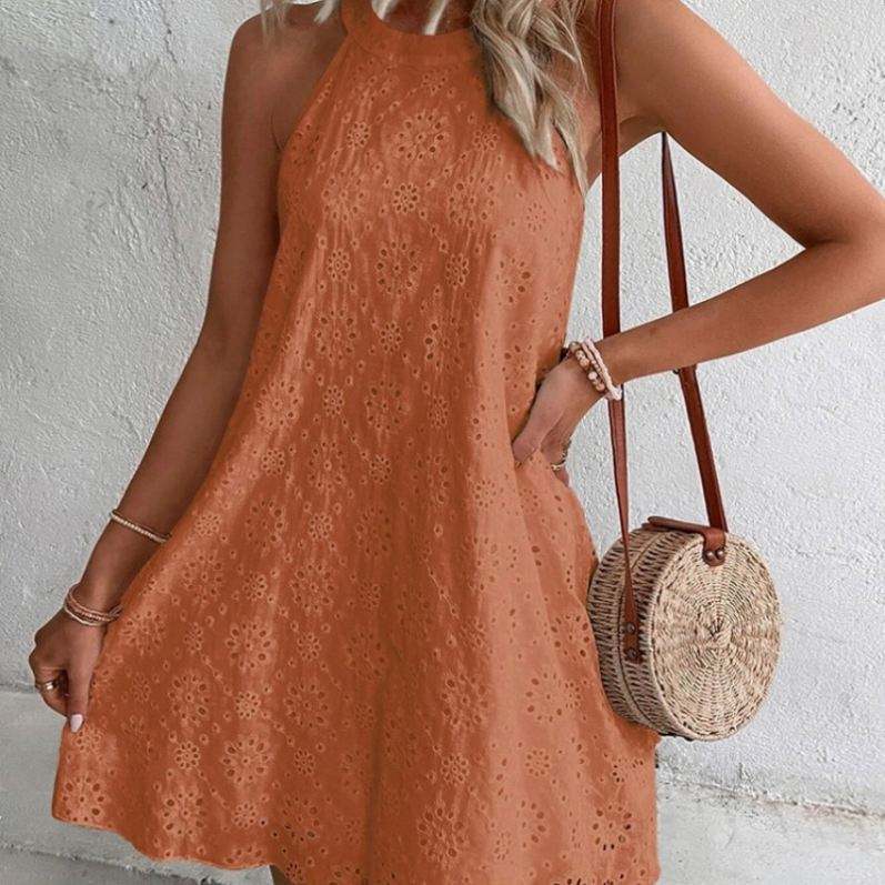 เดรสชีฟองลายดอกไม้คุณภาพสูงแบบขายส่ง ปรับแต่งโลโก้ได้ สายเดี่ยว ผ้าลูกไม้สีพื้น ไม่มีแขน ติดกระดุม