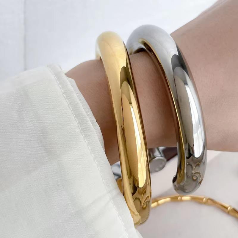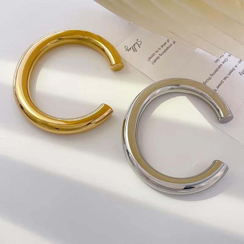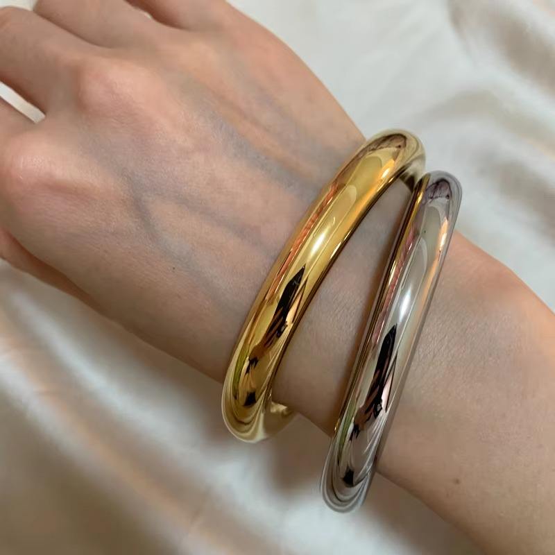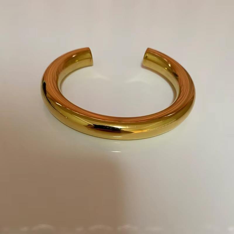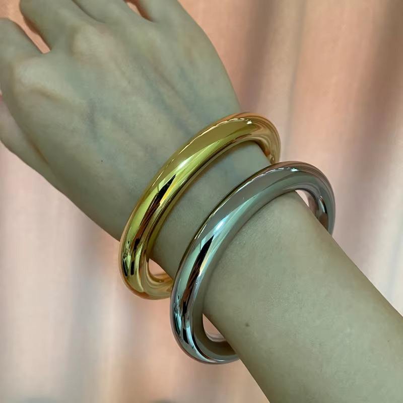 ขายส่งกำไลข้อมือผู้หญิงแบบกำหนดเอง ชุบทอง 10K บนสแตนเลสสตีล คุณภาพสูง เคลือบ PVD ดีไซน์ท่อโปร่งกว้าง รูปทรงเรขาคณิต