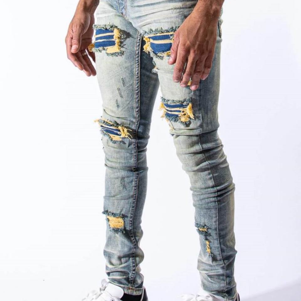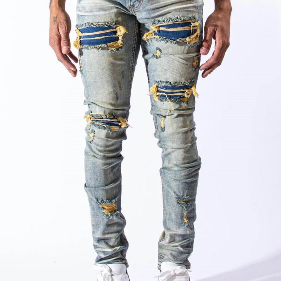 กางเกงยีนส์เดนิมทรงสกินนี่สีน้ำเงินแบบวินเทจ ดีไซน์เนอร์คุณภาพสูง ขายส่ง แบบสั่งทำพิเศษ ขาดเซอร์ๆ แต่งผ้าปะติดปะต่อ สำหรับผู้ชาย