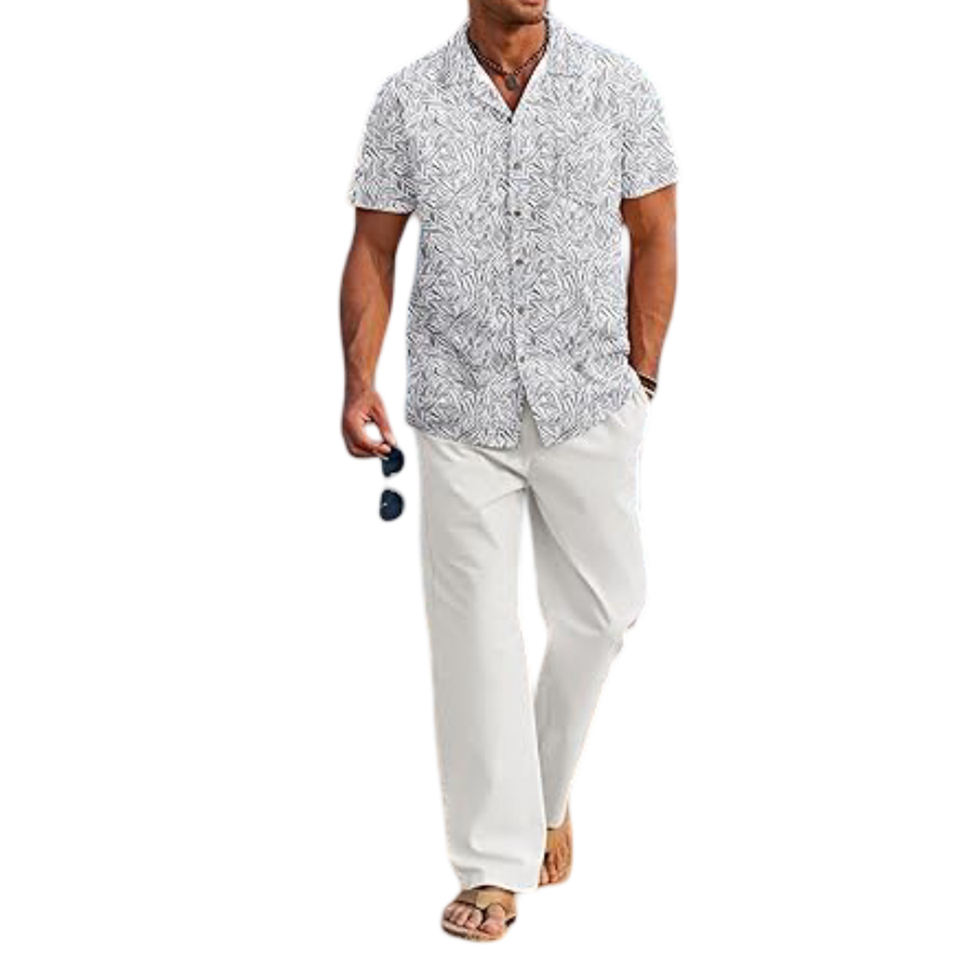 ชุด2ชิ้นผ้าลินินลำลองของผู้ชายเสื้อเชิ้ตมีกระดุมที่ได้รับแรงบันดาลใจจากชายหาดและชุดกางเกงทรงหลวมมีกระดุมปิด
