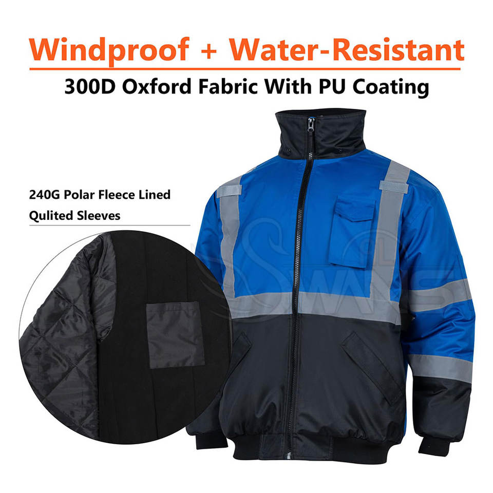 เสื้อแจ็คเก็ตนิรภัยคุณภาพสูงสำหรับฤดูหนาว สะท้อนแสงได้ดี มีโลโก้ด้านหน้า ผลิตจากผ้าฝ้าย/โพลีเอสเตอร์ ออกแบบได้ตามต้องการ ราคาขายส่งสำหรับผู้ชาย