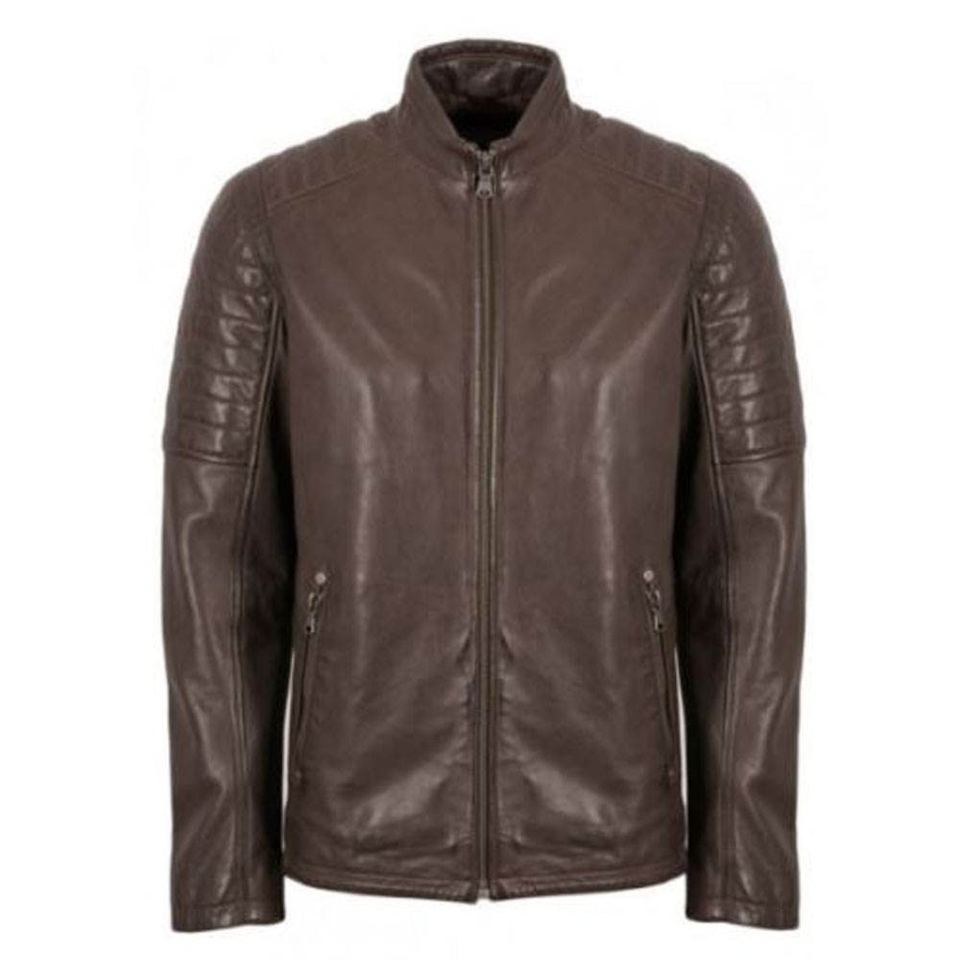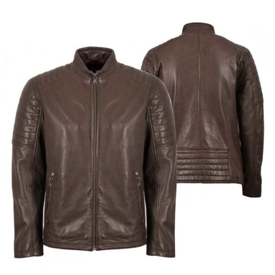 แจ็คเก็ตหนังแกะแท้สีน้ำตาลทรงสลิมฟิตสำหรับผู้ชายคุณภาพสูงสไตล์วินเทจคาเฟ่เรเซอร์ ระบายอากาศได้ดี บริการสั่งทำพิเศษ OEM ด้านหน้า