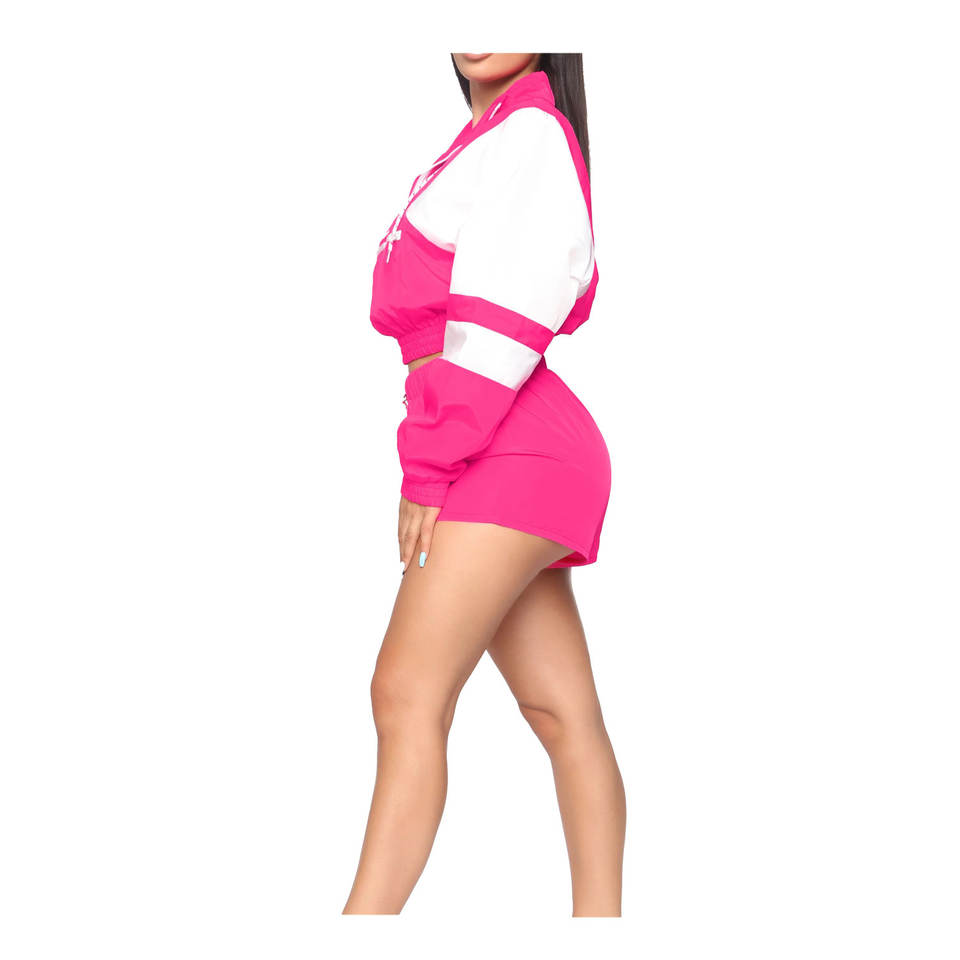 ชุดเซ็ตเสื้อครอปซิปและกางเกงขาสั้นผ้าฝ้ายคุณภาพสูงสำหรับผู้หญิง ลายเรียบ ไซส์พลัส รุ่นสปริง 2026