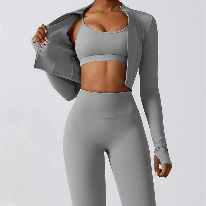 ชุดเสื้อผ้า3ชิ้นสำหรับฟิตเนสบราบราบรายกกระชับก้นแขนยาวสำหรับเล่นกีฬาฟิตเนสโยคะ