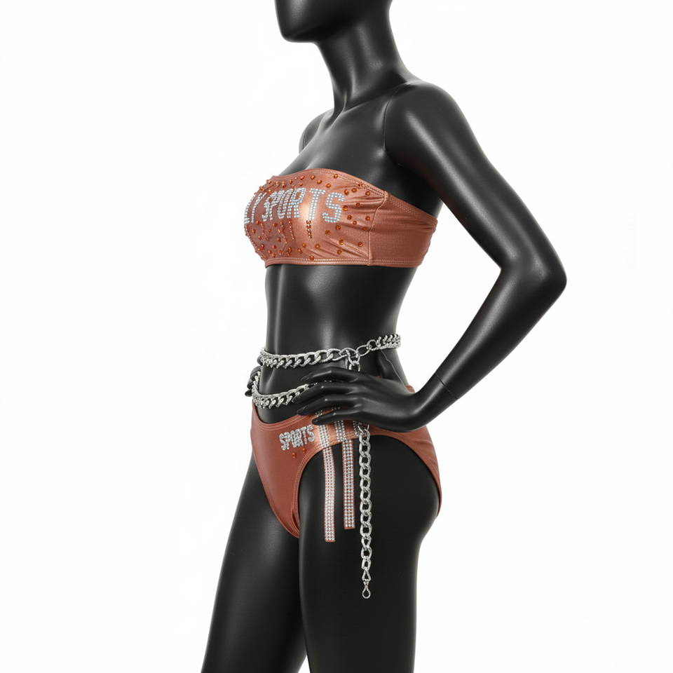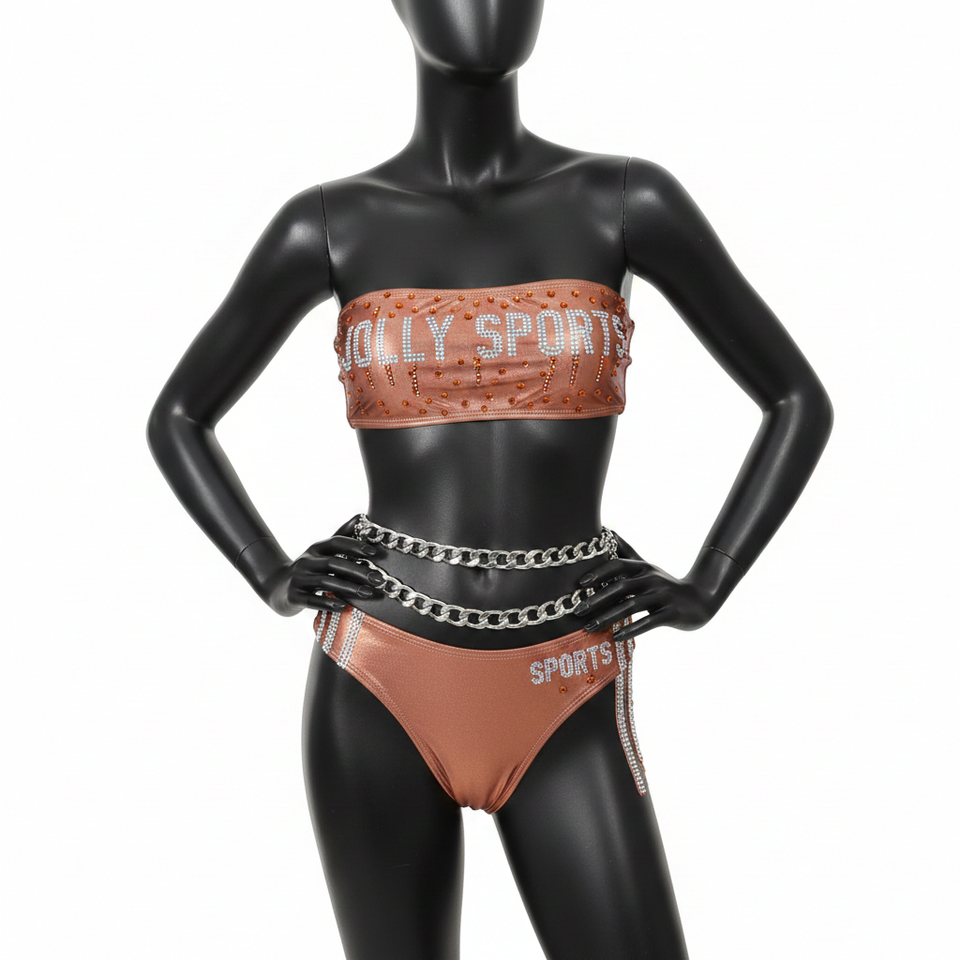 ชุดบิกินี่ผู้หญิงคุณภาพสูง 210 GSM ผ้าโพลีเอสเตอร์ผสมสแปนเด็กซ์เนื้อนุ่ม สีน้ำตาลทองประดับโลโก้คริสตัล
