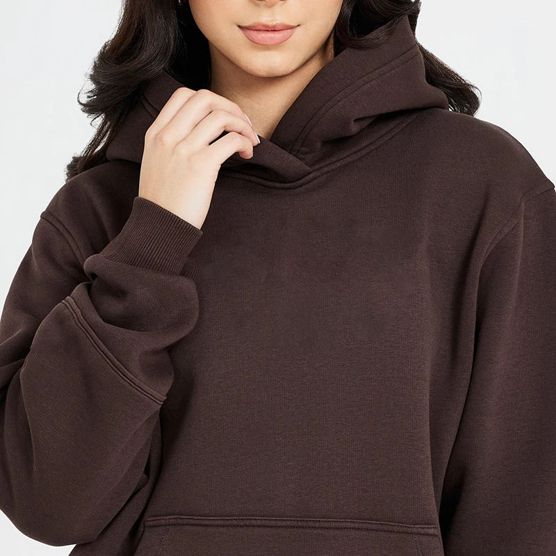 เสื้อฮู้ดดี้โอเวอร์ไซส์คุณภาพสูงสำหรับผู้หญิง สวมใส่สบายในฤดูใบไม้ร่วง/ฤดูหนาว ผลิตจากผ้าฝ้าย/ใยไผ่ ทรงไหล่ตก พร้อมบริการสกรีนโลโก้ตามสั่ง
