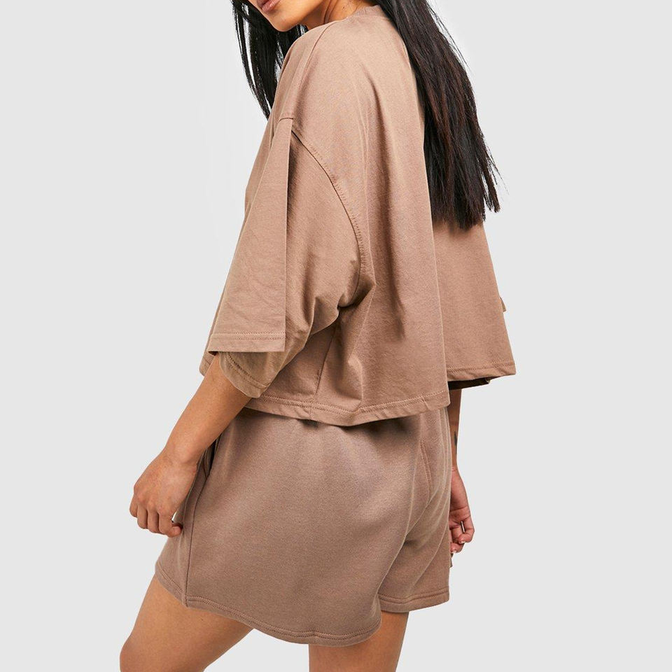 เสื้อยืดครอปคอกลมโอเวอร์ไซส์ผ้าฝ้ายเฟรนช์เทอร์รี่คุณภาพสูงสำหรับผู้หญิง 100% แขนสั้นทรงหลวม ไหล่ตก กางเกงขาสั้น สวมใส่สบาย