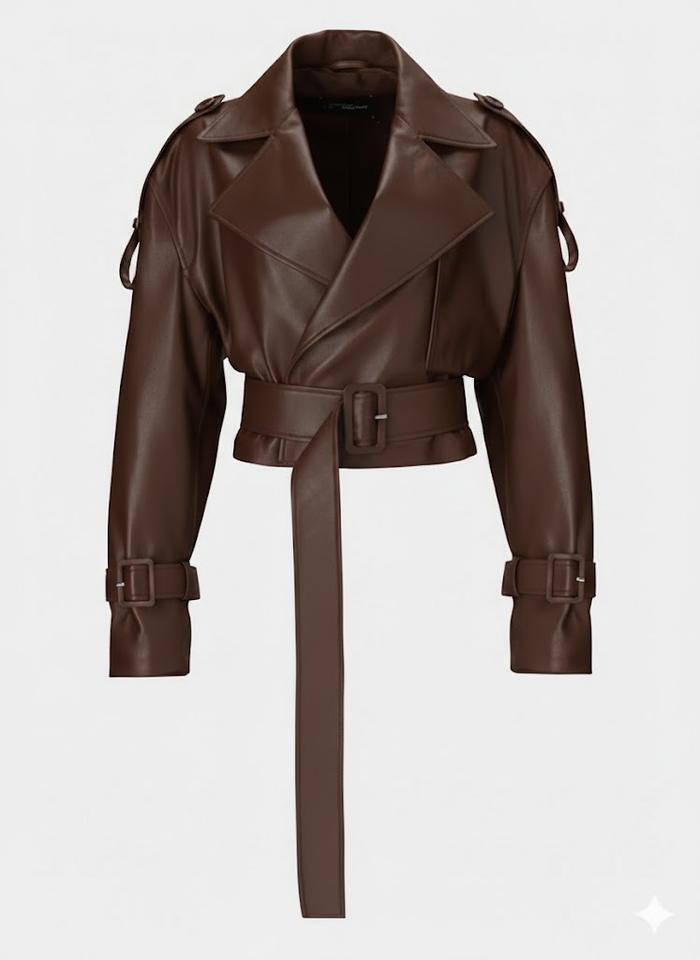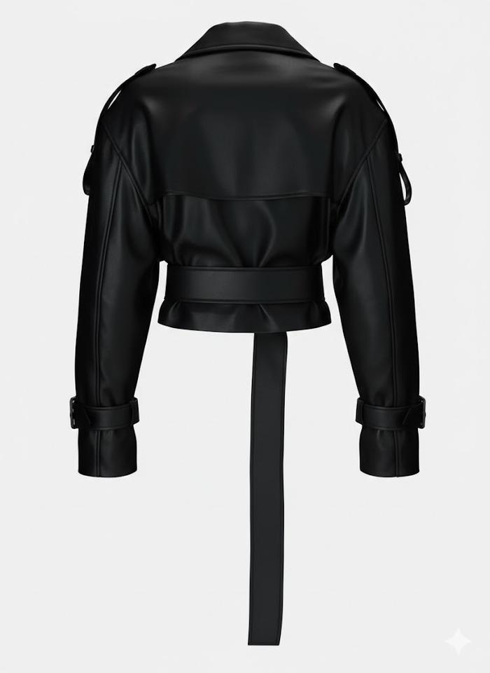 เสื้อโค้ทหนังเทียมทรงครอปคุณภาพสูงสำหรับผู้หญิง แบบกระดุมสองแถว สไตล์ไบค์เกอร์ พร้อมเข็มขัดปรับได้ เสื้อคลุมสตรีทแวร์