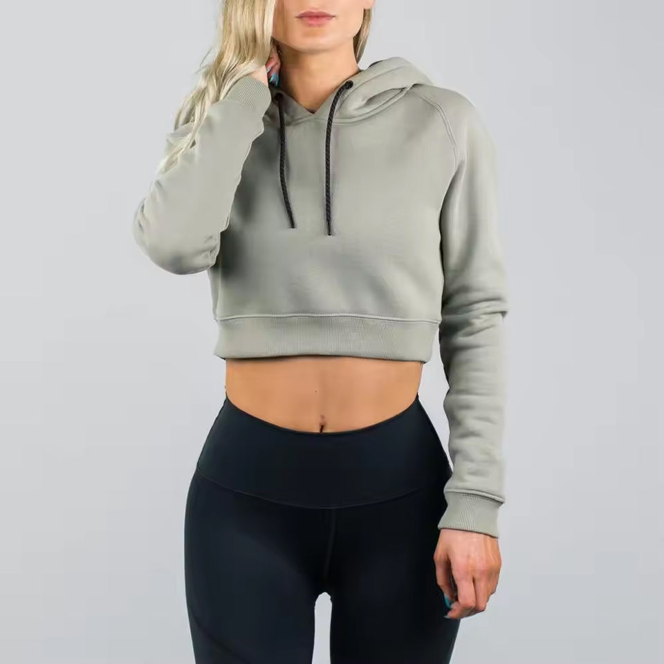 เสื้อฮู้ดครอปแขนยาวพิมพ์โลโก้คุณภาพสูงสำหรับผู้หญิง ระบายอากาศได้ดี ไซส์พลัส เสื้อพูลโอเวอร์ฟิตเนส เสื้อครอปฮู้ดผู้หญิง ขายส่ง