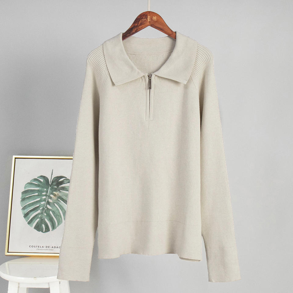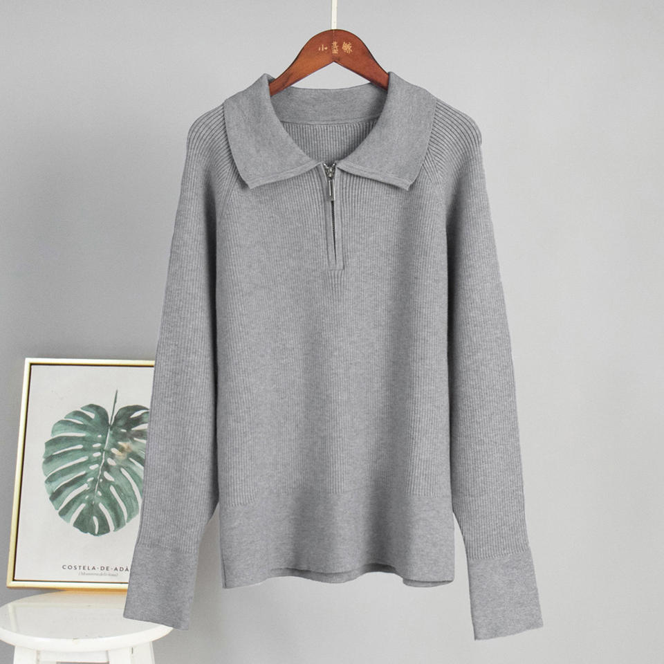 เสื้อสเวตเตอร์ผู้หญิงมีซิปที่หรูหราคอปกแบบพับได้ถักแบบสบายๆสำหรับฤดูใบไม้ร่วงและแฟชั่น